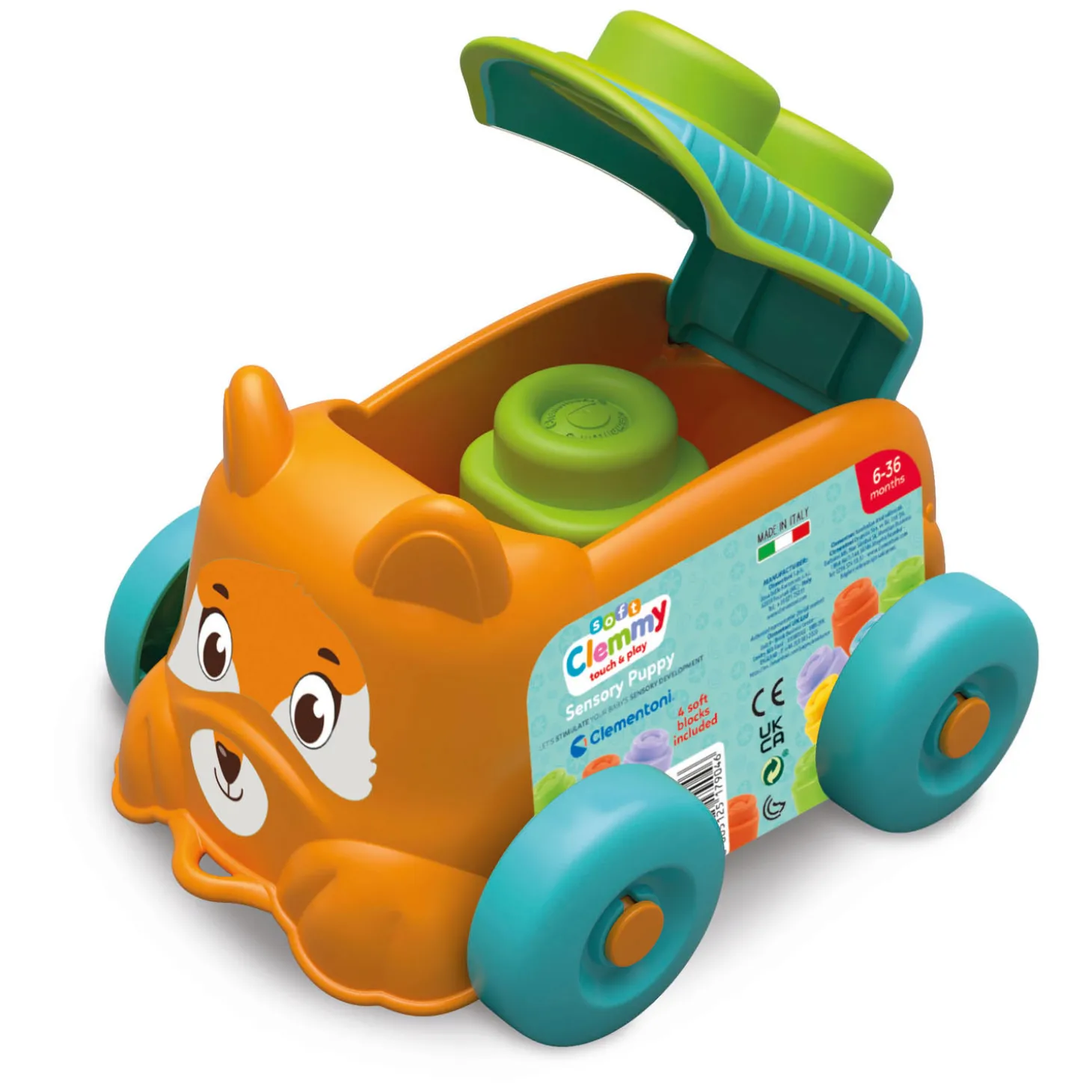 Het hondje is een leuke houder voor het vervoeren van blokken. Het deksel heeft inzetstukken van hetzelfde materiaal als de zachte blokken waardoor het mogelijk is de blokken erop vast te zetten. Bevat 4 zachte Clemmy blokken De texturen in reliëf stimuleren de zintuiglijke ontwikkeling van het kind en helpen hem zijn handvaardigheid te verbeteren. Ontdek alle sensorische spellen van de serie Soft Clemmy! Laat je kind in alle veiligheid spelen met Clemmy: getest materiaal, vaatwasbestendig, en heel zacht!
