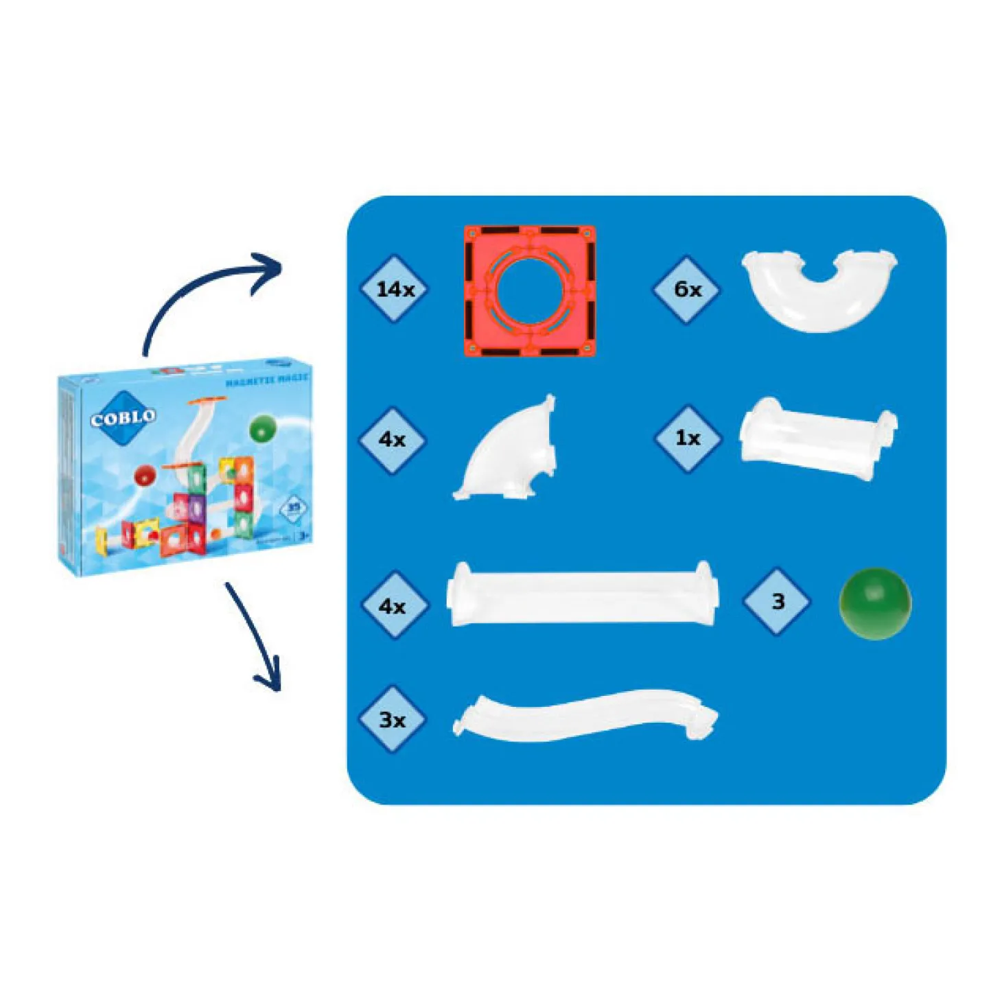 De Coblo Knikkerbaan is een van de nieuwe bouwsets van Coblo. Deze uitbreidingsset bestaat uit 35 onderdelen waarmee kinderen hun Coblo basis set (classic of pastel) om kunnen toeveren tot een knikkerbaan. En wanneer je de Coblo knikkerbaan 100 stuks al hebt, kun je deze nog groter maken met deze uitbreiding. Kinderen zetten zelf de knikkerbaan in elkaar en deze kan iedere keer weer anders zijn.