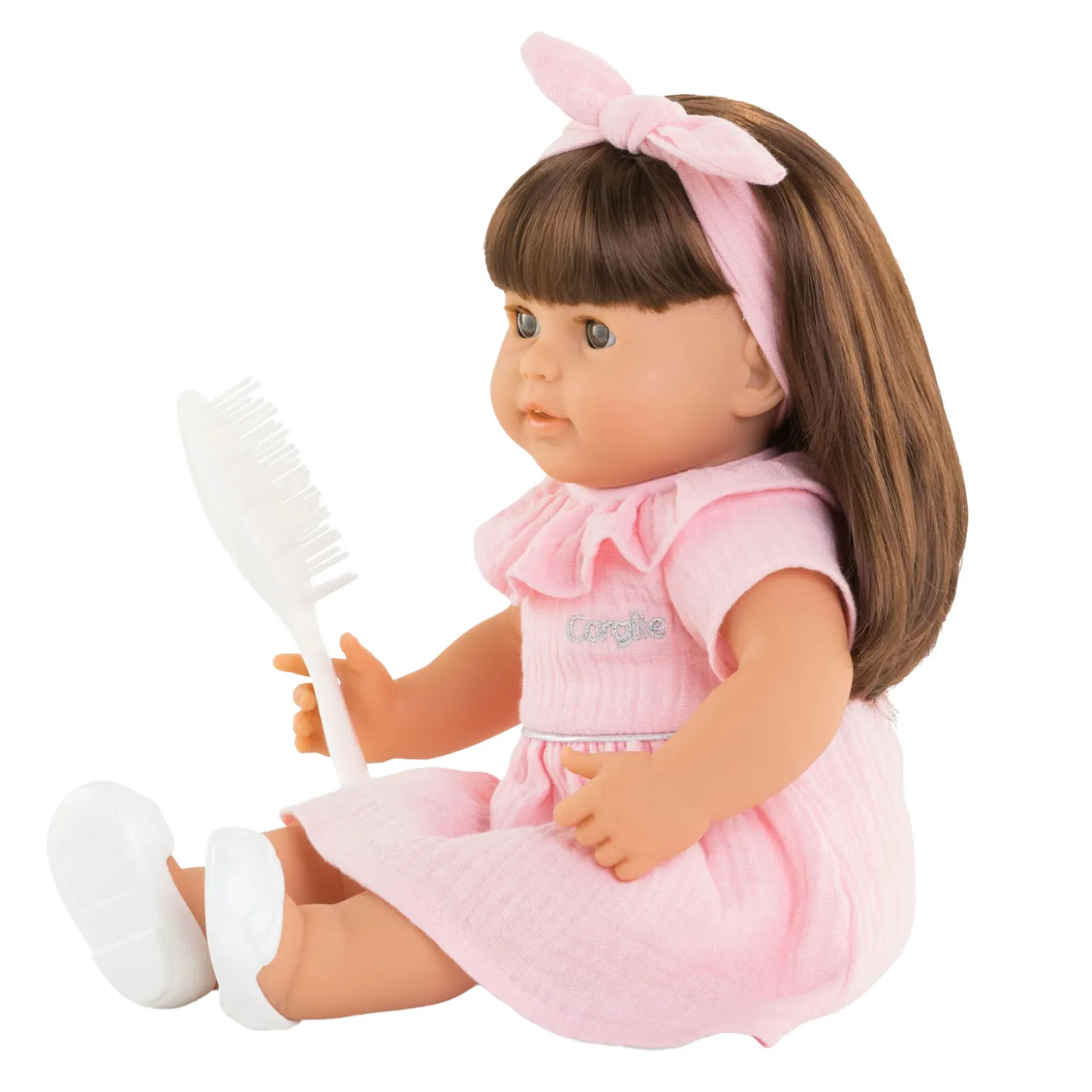 Deze grote babypop met witte huid en bruine ogen heeft alle kenmerken van een Corolle-babypop: haar gezicht, armen en benen zijn gemaakt van zacht aanvoelend vinyl en hebben een delicate geur van vanille.