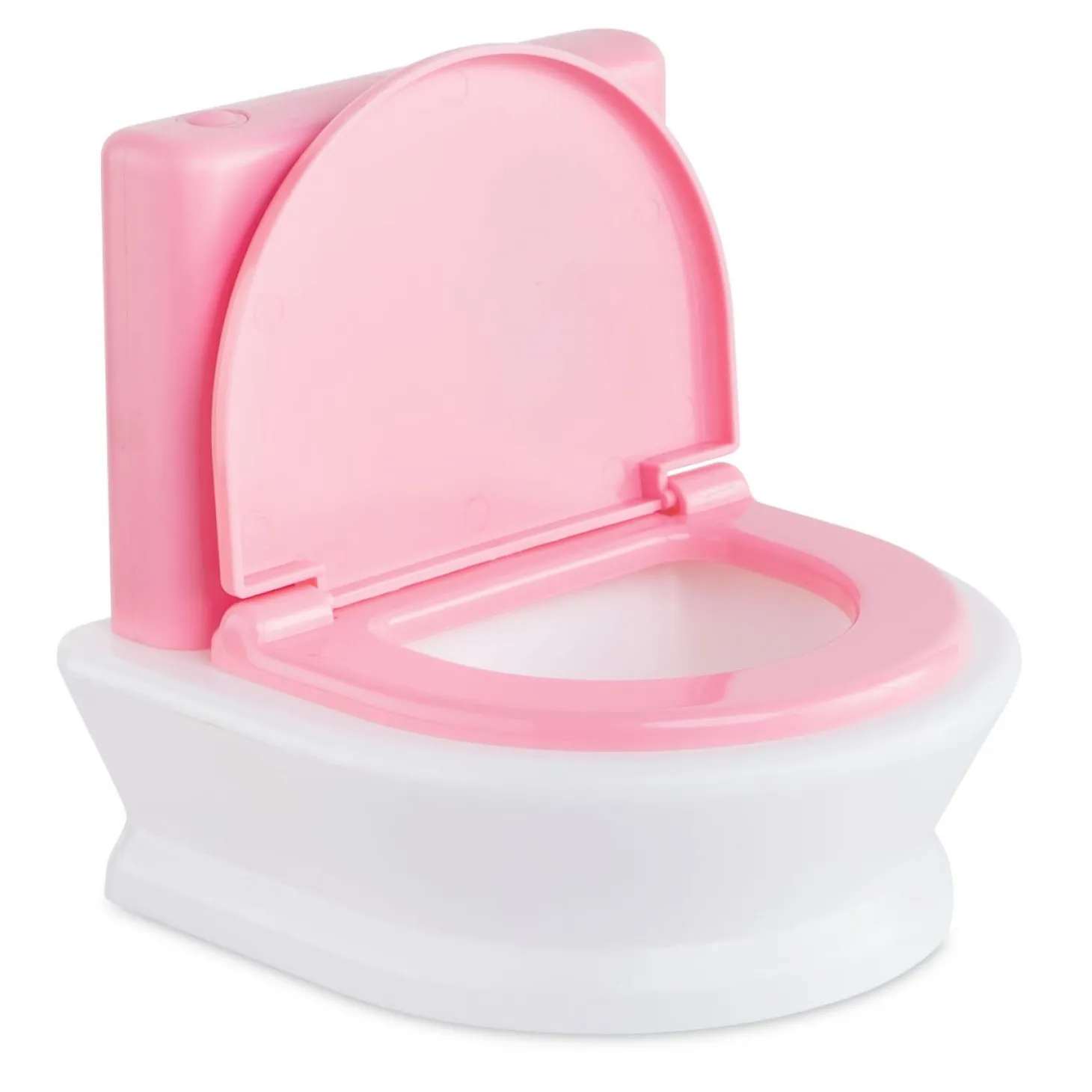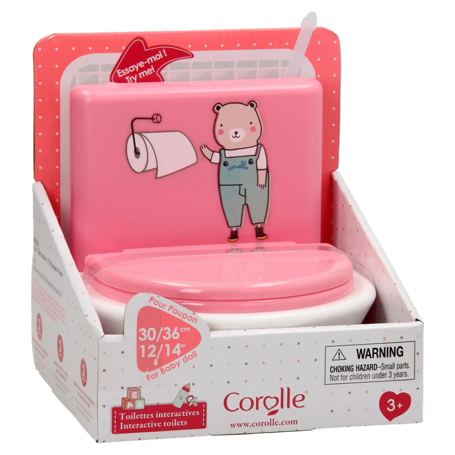 Laat jouw pop een plasje doen op de Corolle Mon Grand Poupon Interactieve WC. Wanneer je pop klaar is met het doen van een plasje of een grote boodschap druk je op het roze knopje, je hoort dan alsof de wc echt aan het doorspoelen is. Werkt op 3 knoopcel batterijen (batterijen zijn inbegrepen). Geschikt voor Corolle poppen van 36 centimeter.