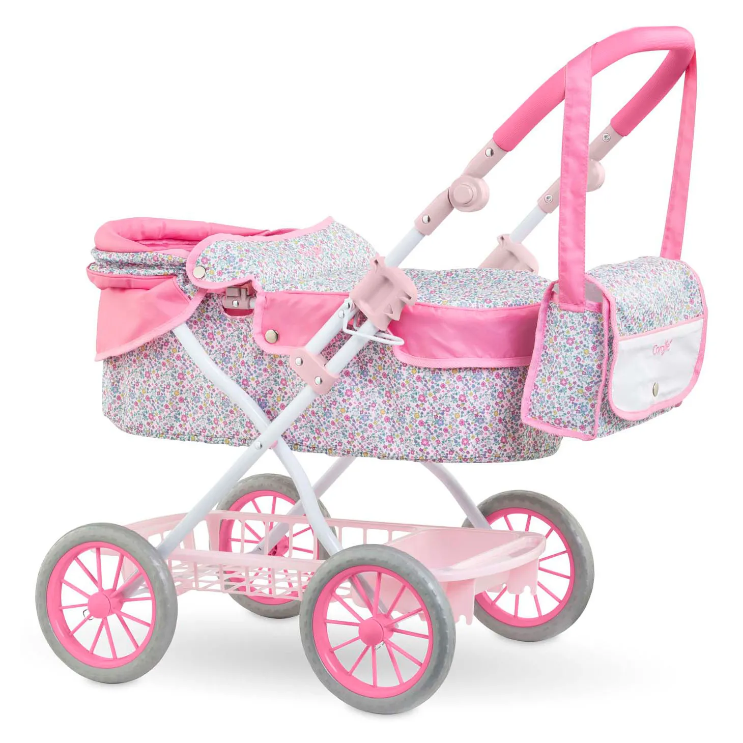 Als het erg mooi en warm weer is, kan de kap worden omgevouwen en met behulp van de drukknopen worden verwijderd. Zo voorkomt je dat de babypop een zonnesteek krijgt! De vrolijke poppenwagen wordt geleverd met een schoudertas waarin je alles kunt meenemen wat je pop nodig heeft en een uitneembare opbergmand om nog meer accessoires mee te nemen!