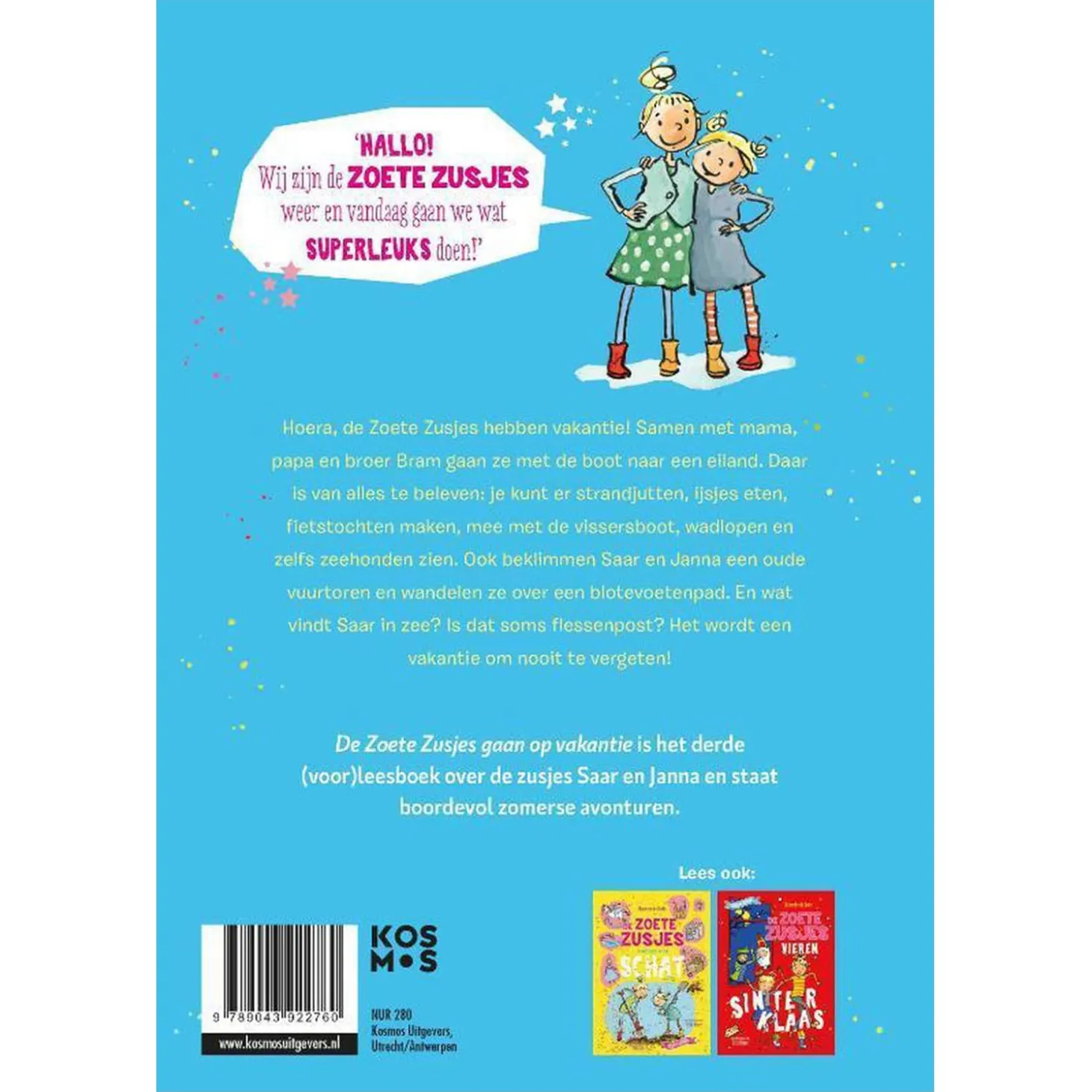 Ga met de Zoete Zusjes mee op reis naar een prachtig eiland. Spreken ze daar wel Nederlands? Dat maakt niet uit, als er maar genoeg te doen is! Je kunt er strandjutten, ijsjes eten, fietstochten maken, mee met de vissersboot, wadlopen en zelfs zeehonden zien. Samen met papa, mama en broer Bram beklimmen Saar en Janna een oude vuurtoren, wandelen ze over een blotevoetenpad en bezoeken ze het Juttersmuseum. En wat vindt Saar in zee? Is dat soms flessenpost? Het wordt een vakantie om nooit te vergeten!