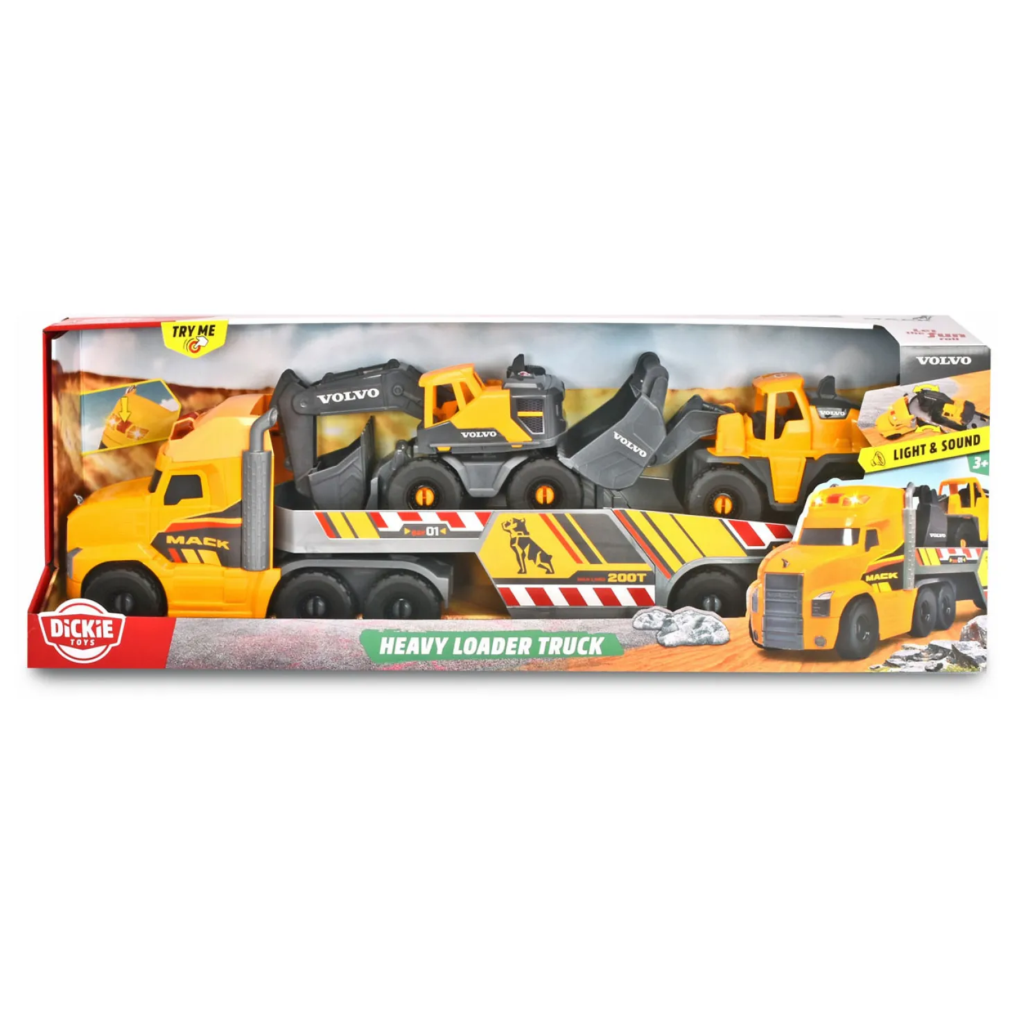 hun eigen fantasie -bouwplaats. De Dickie Toys Heavy Loader Truckset omvat een grote Mack -vrachtwagen met een laadoppervlak. De schoparmen en schoppen op de bouwvoertuigen kunnen worden verplaatst,