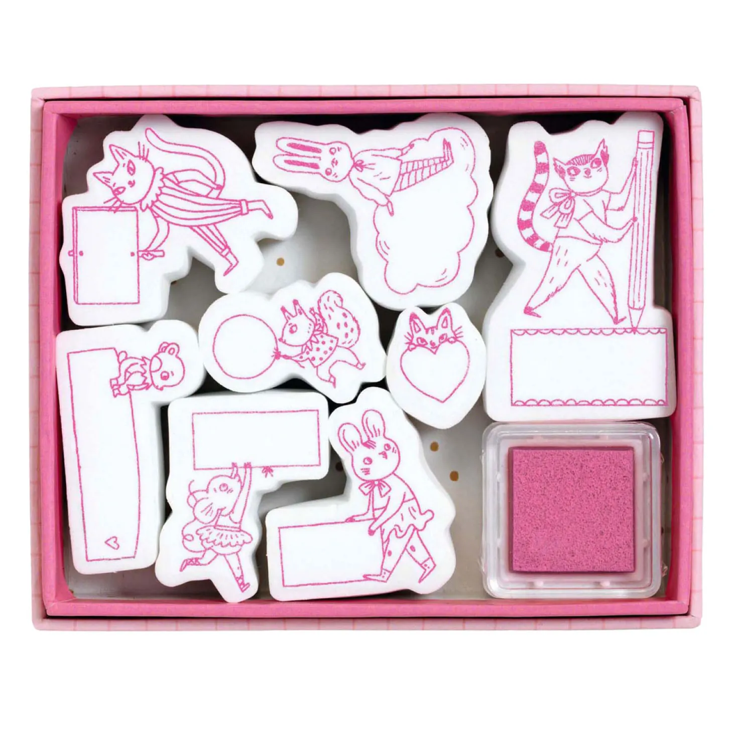 Inhoud: 1 kartonnen doosje (13 x 10,5 x 2 cm) met 8 stempels + 1 stempelkussen.