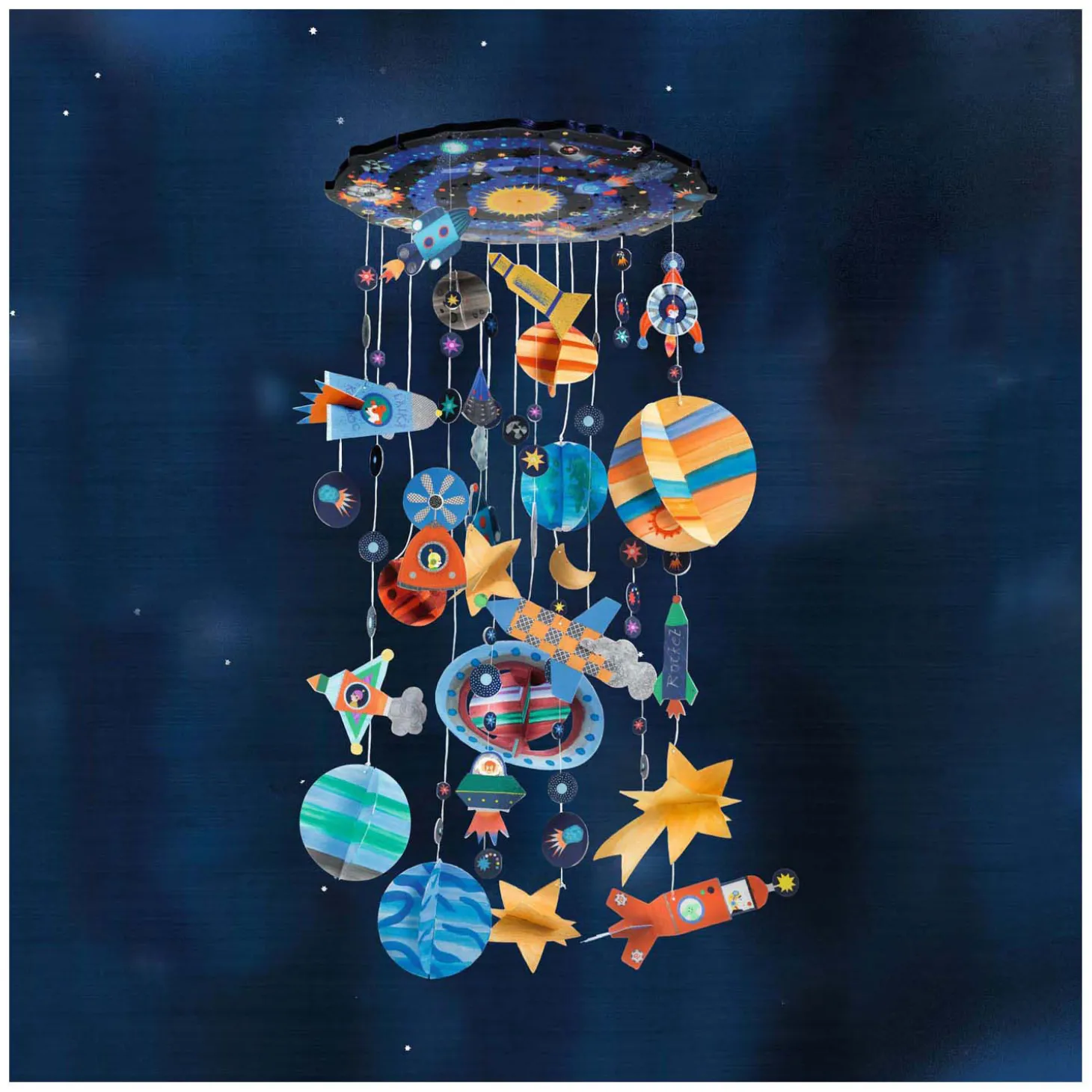 Beschilder de planeten en sterren met de 8 kleuren verf. Wanneer ze droog zijn maak je de mobiel gemakkelijk af met raketten, kometen, sterren en meer!