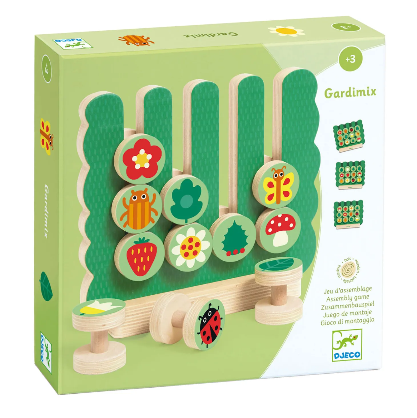 Het spel bevat 10 dubbelzijdige kaarten met 20 voorbeelden in totaal, 12 houten figuren met een voor- én achterkant en een houten plankje waar de figuurtjes in geschoven worden. Gardimix is geschikt voor kinderen vanaf 3 jaar en draagt bij aan het verbeteren van de observatievaardigheden.