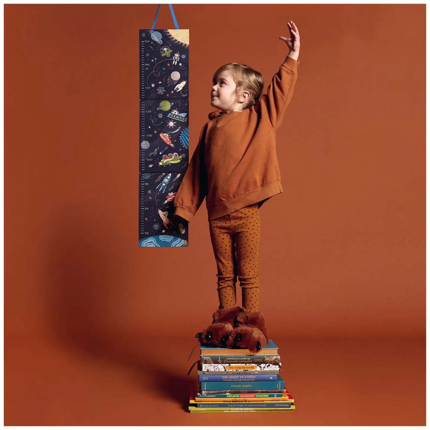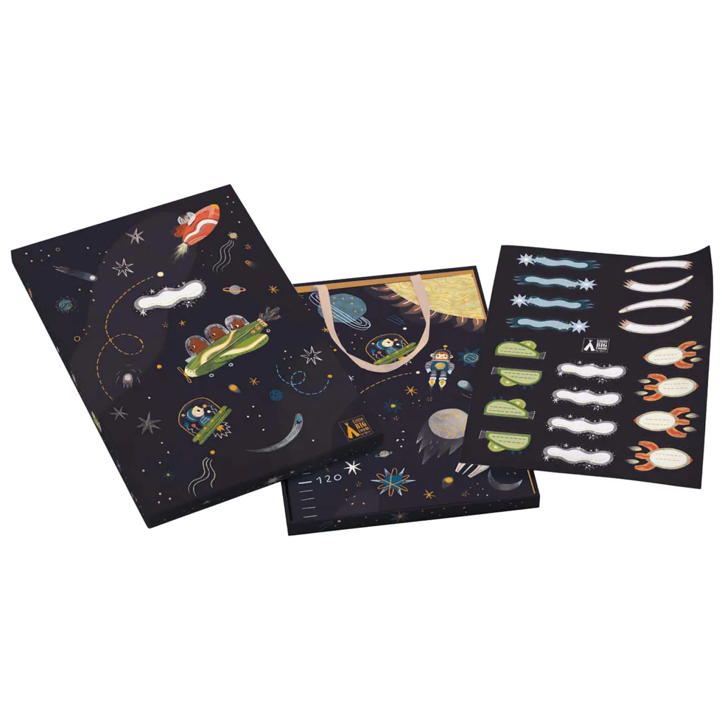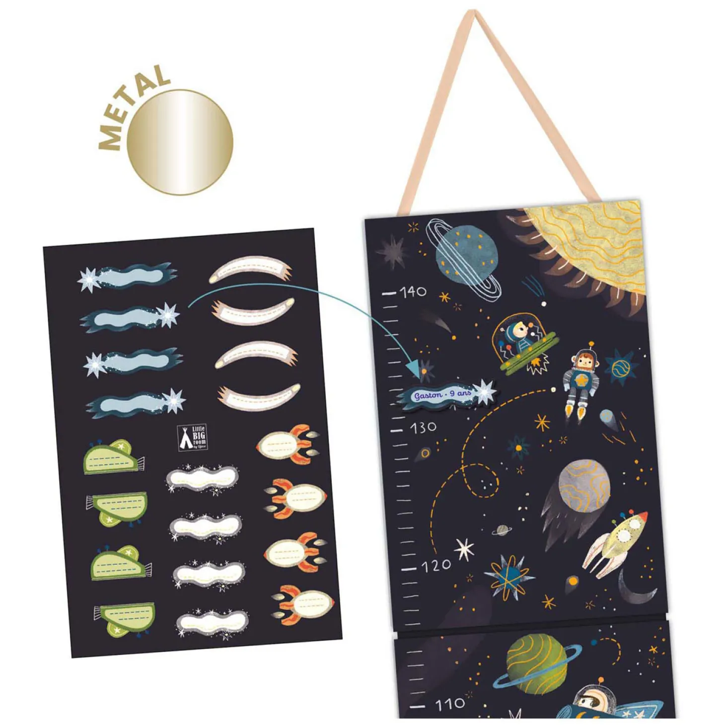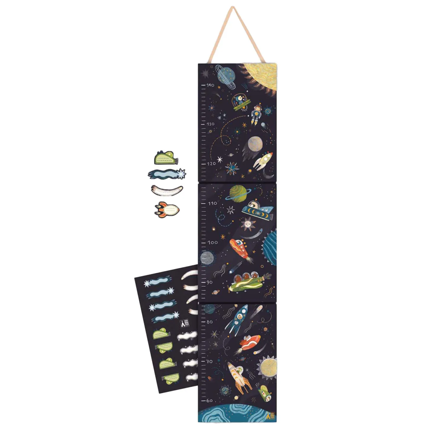 Een grote meetlat voor aan de muur met veel herbruikbare stickers met als thema de ruimte! De meetlat is 140 cm hoog en kan dus lang gebruikt worden! En als het kind groot is, kan hij in de mooie doos bewaard worden als dierbare herinnering.