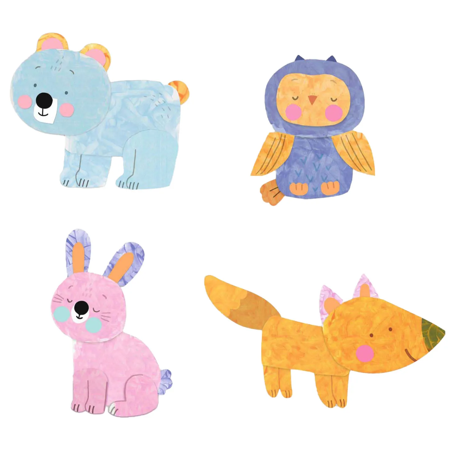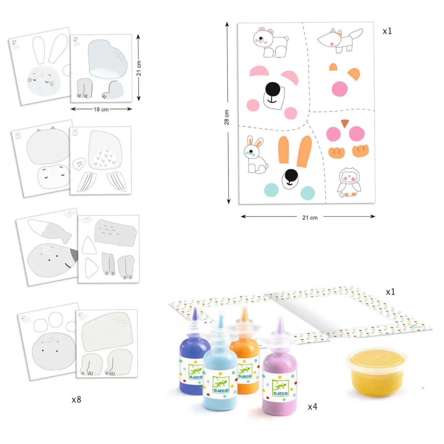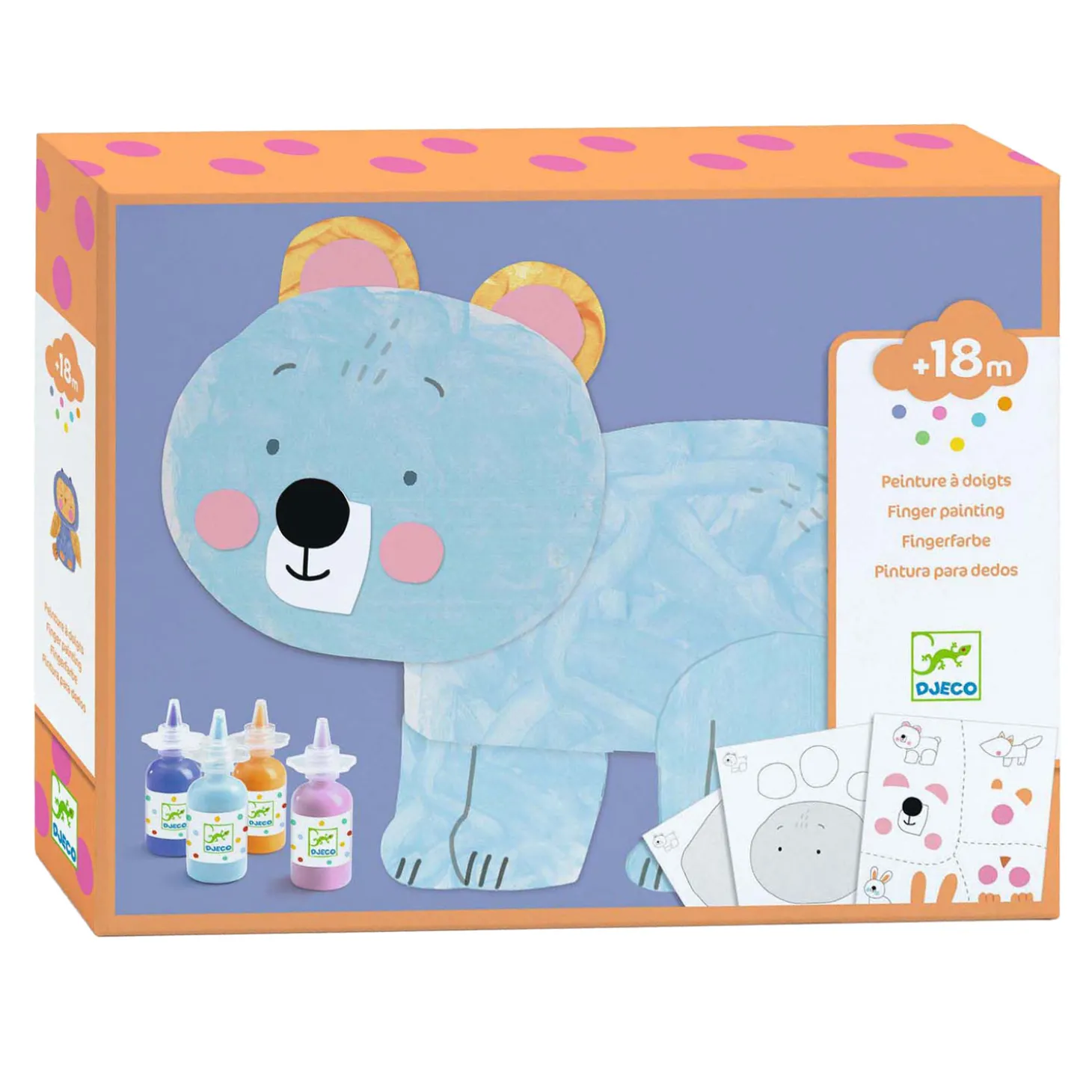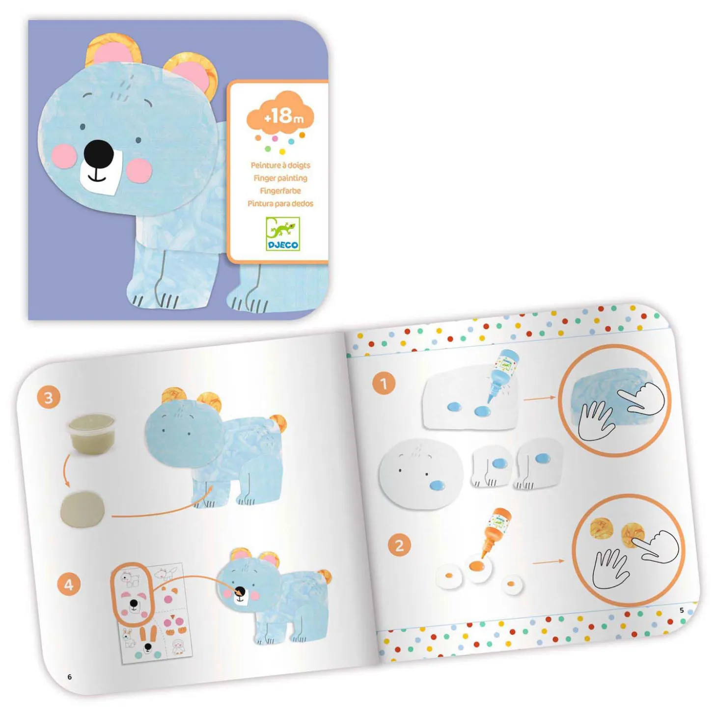 De eerste schilderactiviteit vanaf 18 maanden! Met een beetje hulp van een volwassene kunnen kleine kinderen de mooiste vingerverf kunstwerken maken. Geef de beer, het vosje, het konijn en het uiltje vrolijke kleuren!