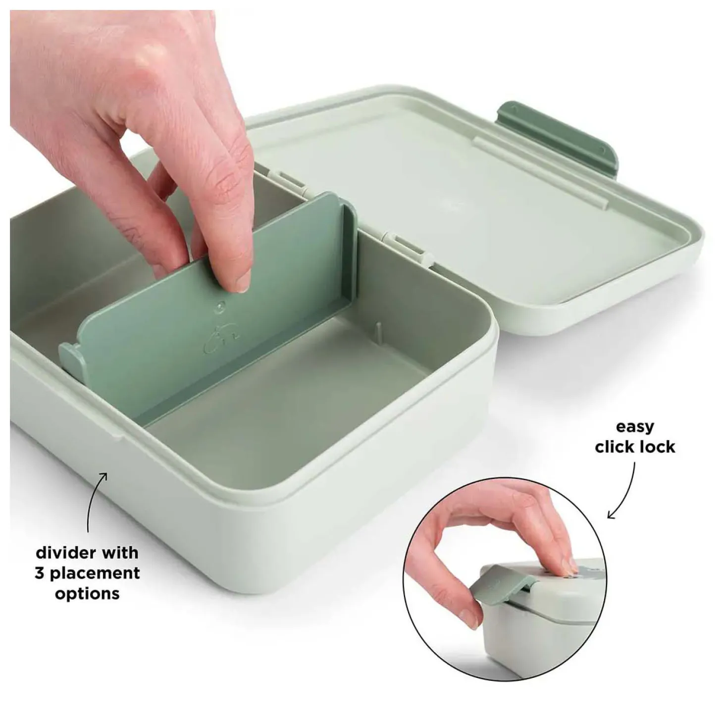 Dankzij een slimme, verwijderbare verdeler kun je eten en snacks precies zo verdelen als je kind het lekker vindt: boterhammen aan de ene kant, fruit of knapperige groenten aan de andere kant. Dankzij de flexibele plaatsingsmogelijkheden past hij zich aan verschillende maaltijden en snacks aan, elke dag opnieuw.