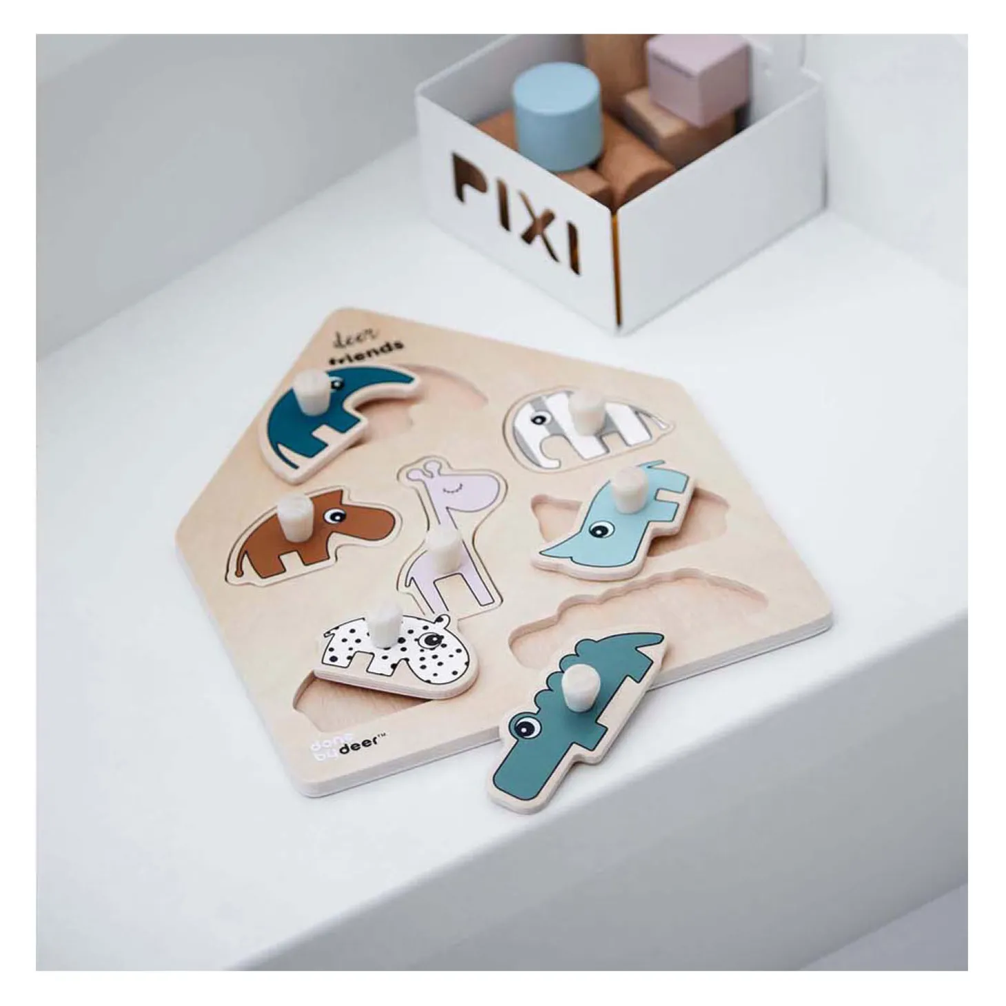 Kleine vingertjes kunnen de puzzelstukjes vastpakken en de Deer-vrienden helpen hun weg terug naar hun plek te vinden.