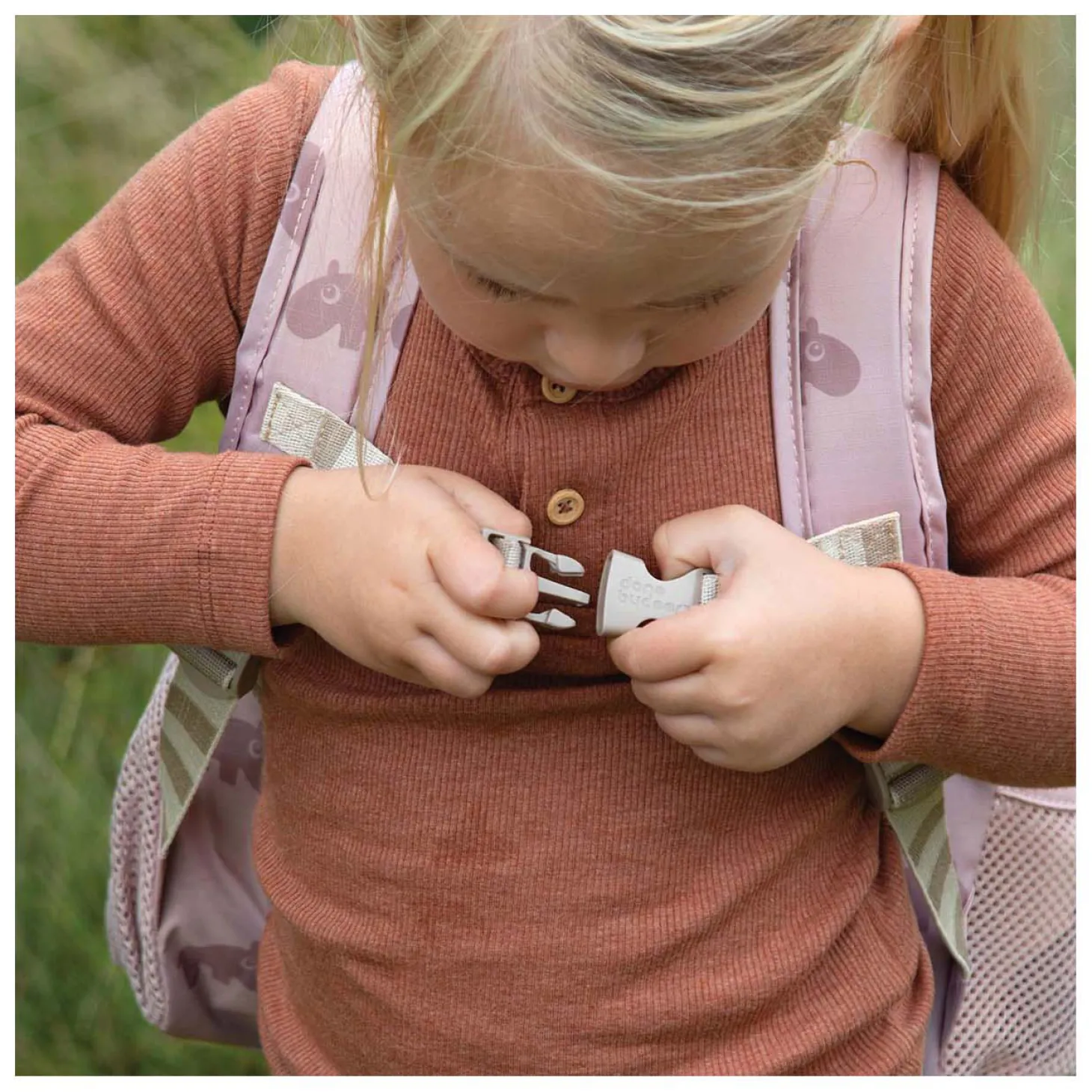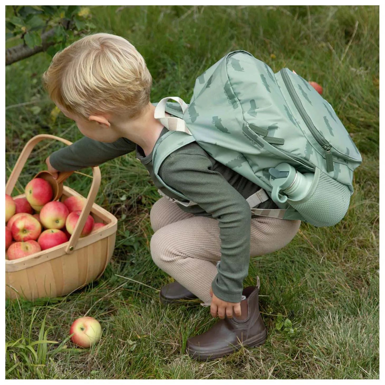 De rugzak heeft een grote ruimte waar gemakkelijk een broodtrommel, kleren en alle eigenzinnige vondsten in passen die je kind onderweg oppikt. Hij heeft twee zijvakken met elastiek waar een fles in past en een voorvak.