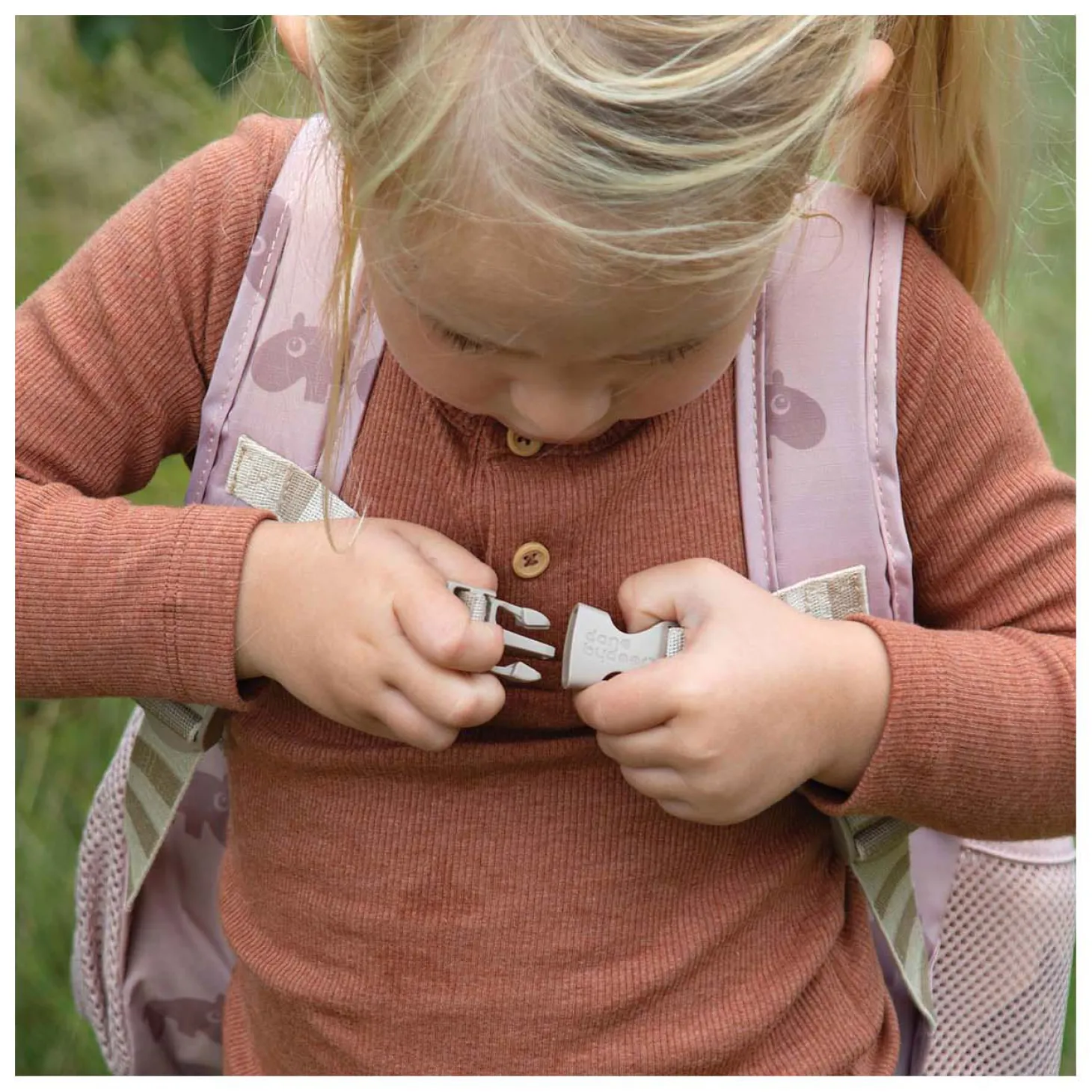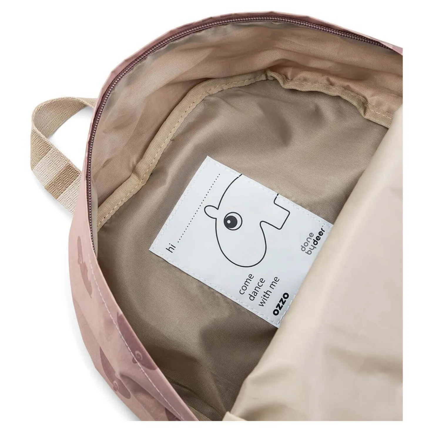 De kinderrugzak in poeder is versierd met de schattige nijlpaard Ozzo. Hij is gemaakt van 100% polyester, wat duurzaam en weerbestendig is. Binnenin zit een leuk naamplaatje waarop Ozzo je kleine ontdekkingsreiziger uitnodigt om met hem te komen dansen.