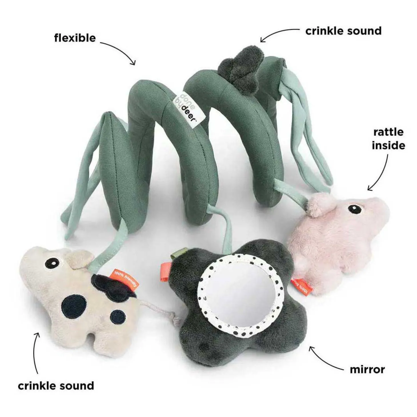 •Voorzien van rammelaar, bel en knisperend materiaal