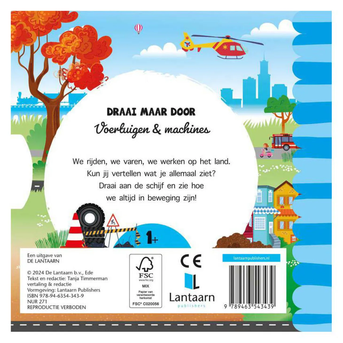 Overal om ons heen zijn voertuigen en machines te vinden. Op het land rijdt de boer in zijn tractor, in de stad is het druk op straat met auto’s en op de bouwplaats zie je hijskranen, graafmachines en kiepwagens. Door aan de stevige schijf te draaien verschijnt er telkens iets anders in de gaatjes! Een kleurrijk boek met vrolijke rijmpjes om voor te lezen.