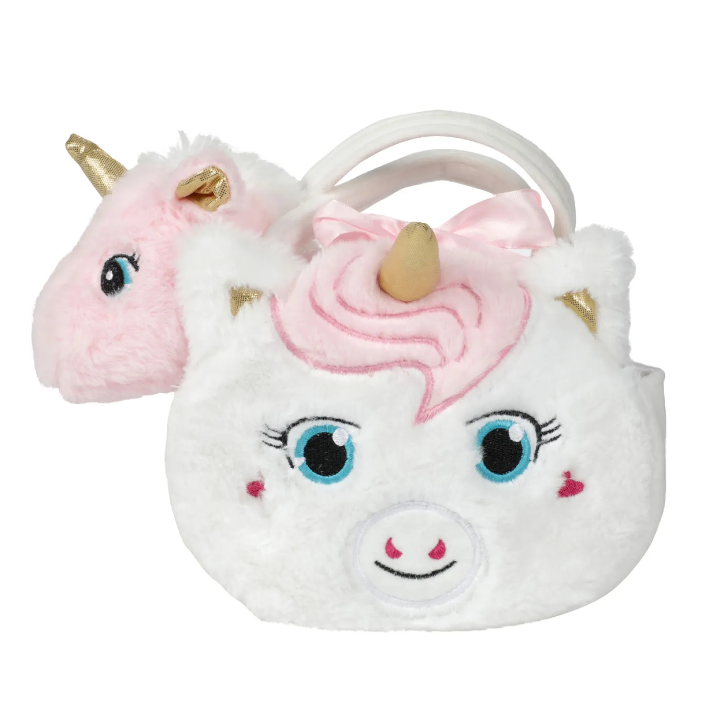 Deze lieve eenhoornknuffel van pluchen neem je supermakkelijk overal mee naartoe! Hij heeft namelijk zijn eigen eenhoorntas met een handig handvat. Cute! De eenhoorn is uitneembaar en natuurlijk ook lekker mee naar bed te nemen. Het eenhoorntasje heeft een lief gezichtje en twee zachte oortjes. Afmetingen: 10 x 27 x 25 centimeter. Geschikt voor kinderen vanaf 18 maanden oud.Prijs per stuk, verschillende uitvoeringen/kleuren worden door elkaar geleverd.