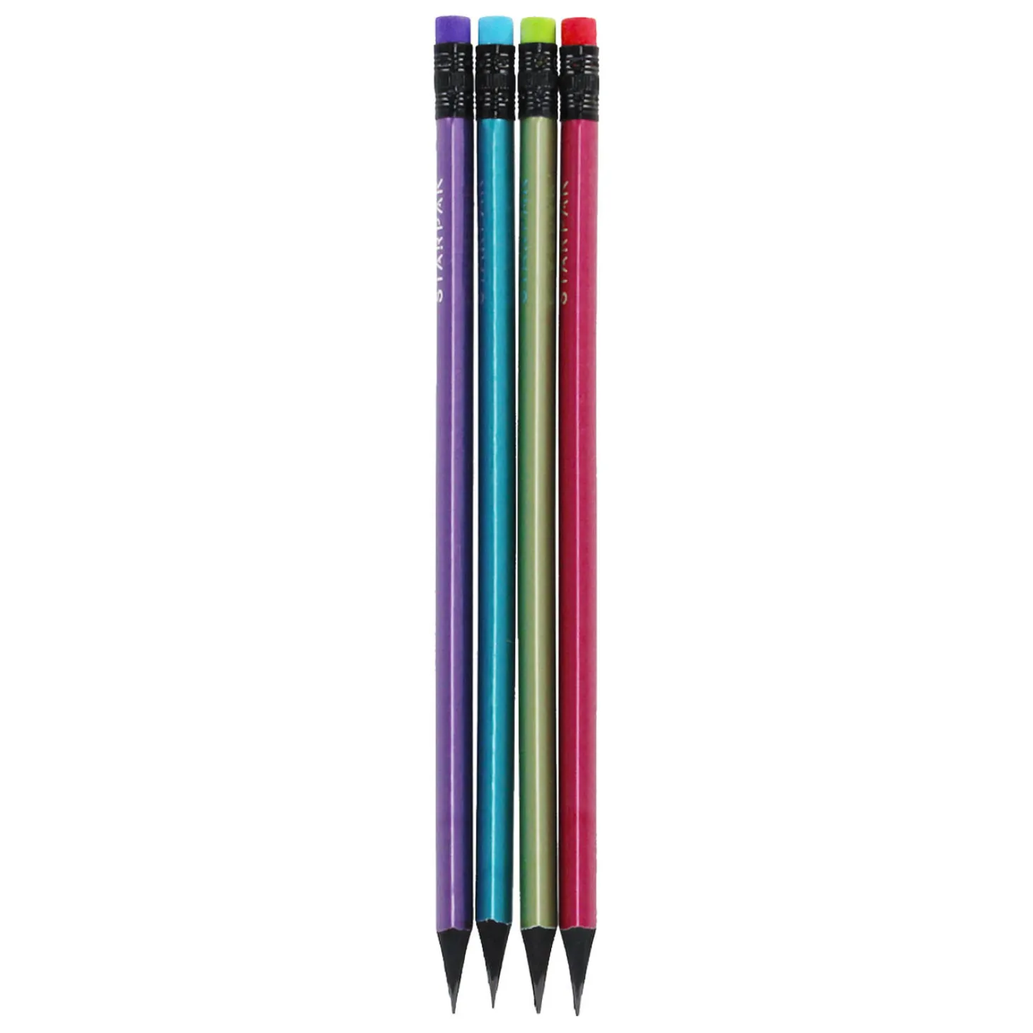 De potloden schrijven grijs en hebben een gemiddelde HB-hardheid. De buitenkant is mooi vormgegeven in 4 glanzende parelmoerdesigns en elk potlood heeft een eigen gummetje aan het uiteinde. Geschikt voor kinderen vanaf 3 jaar oud.