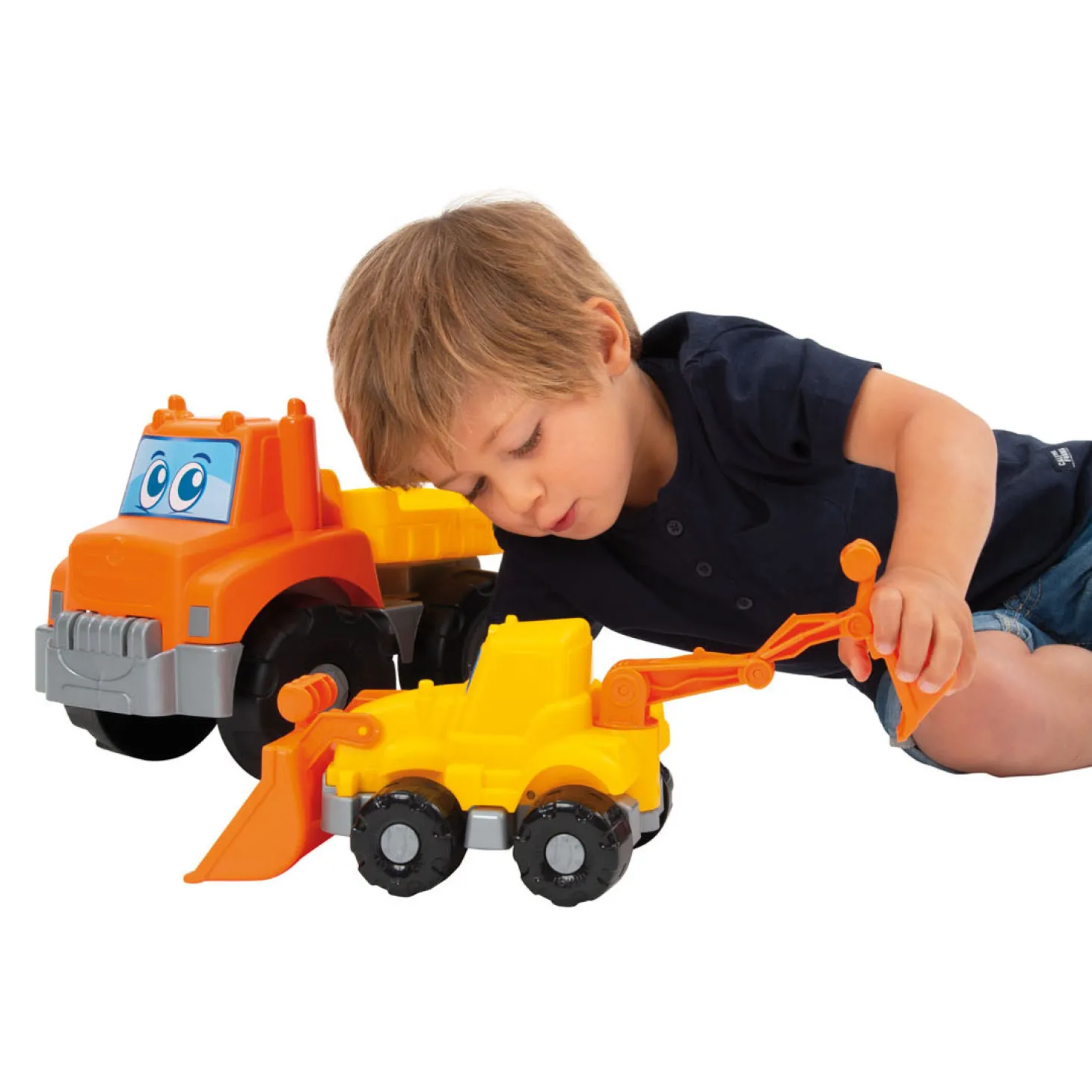 Deze vrachtwagen en graaflaadmachine met voorschop en een bak met een knikarm krijgen iedere klus geklaard! De stevige werkvoertuigen zijn voorzien van vrolijke ogen en gele/oranje kleuren. Geschikt voor kinderen vanaf 18 maanden.