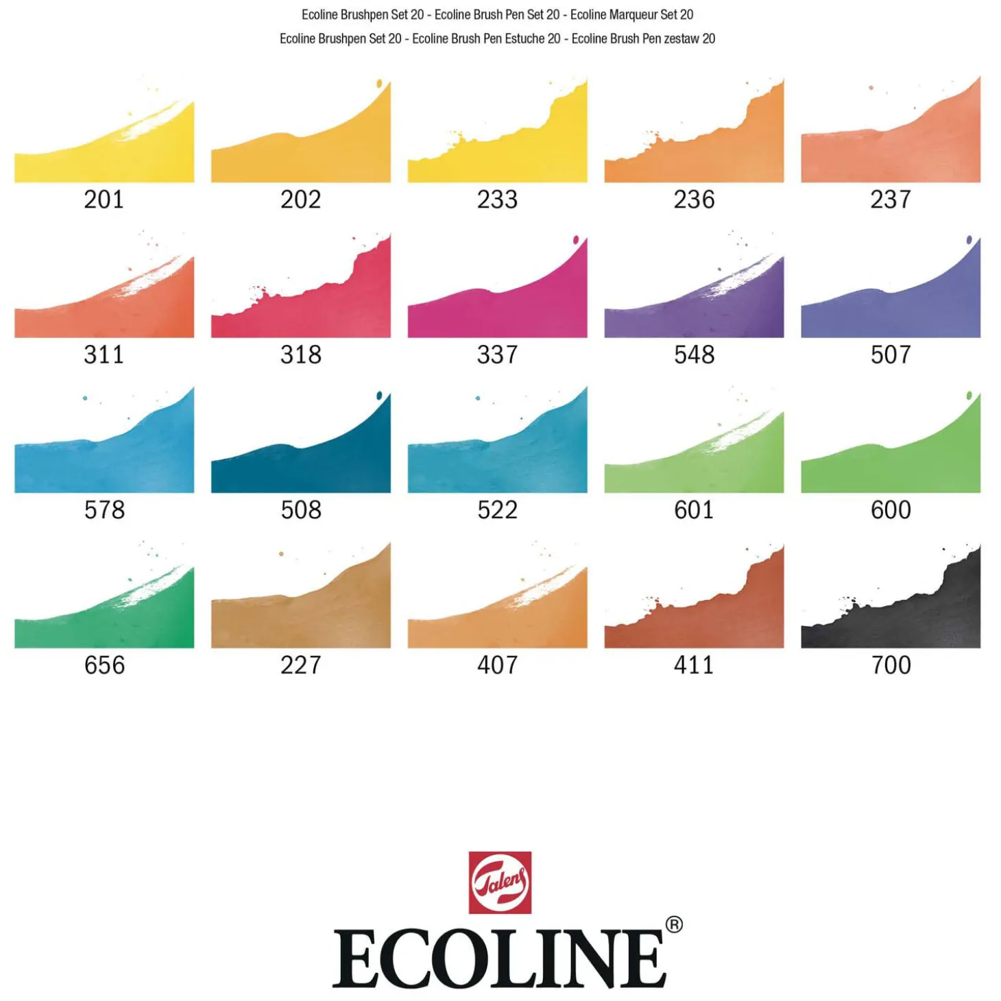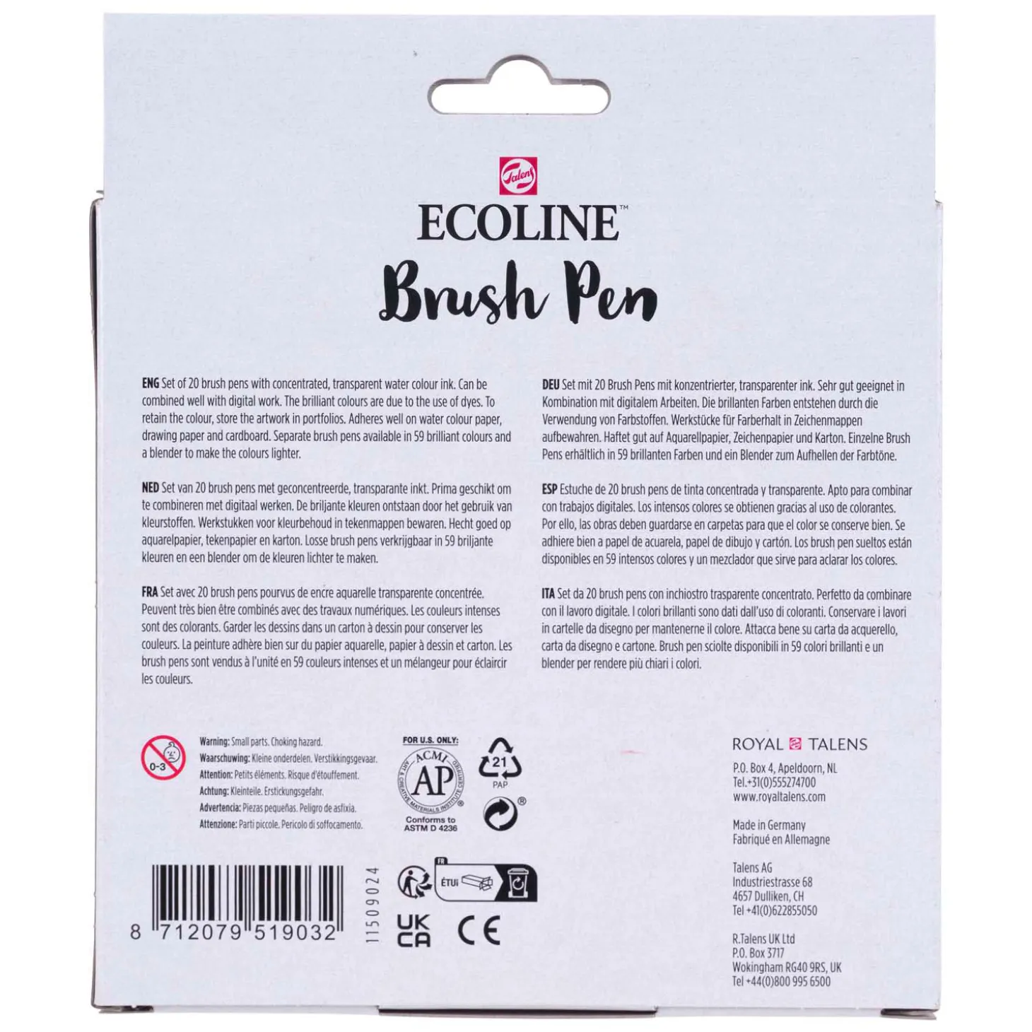 Deze set bevat 20 Ecoline Brush Pens in levendige basistinten. De Brush Pen kenmerkt zich door de flexibele punt en het uitgebreide assortiment schitterende kleuren dankzij de pure formule op kleurstofbasis. De transparante kleuren bieden de beste resultaten bij gebruik op wit of zeer lichtgekleurd papier. Indien gewenst kun je de kleurintensiteit gemakkelijk verminderen door ze te verdunnen met water of met de Brush Pen blender. Deze pennen zijn perfect voor handlettering, aquareltekeningen, snelle schetsen en finishing touches.