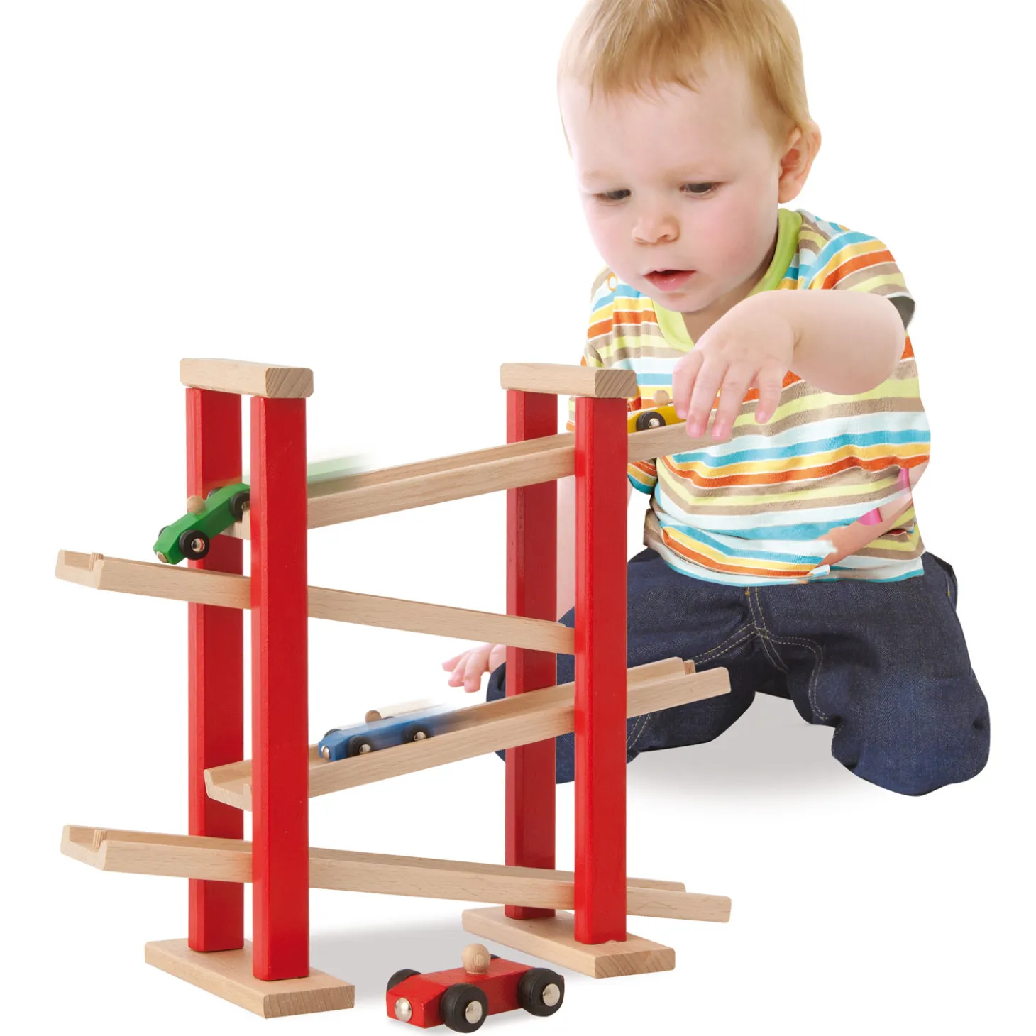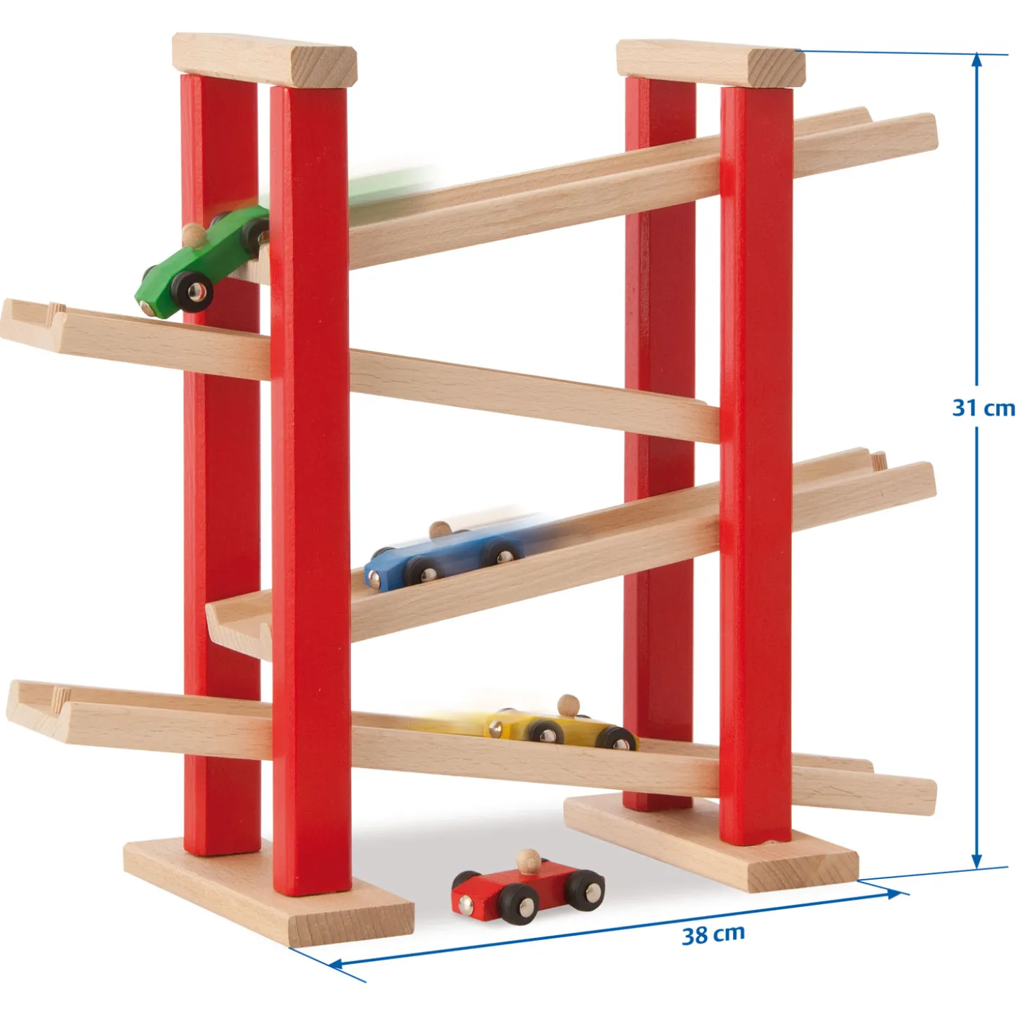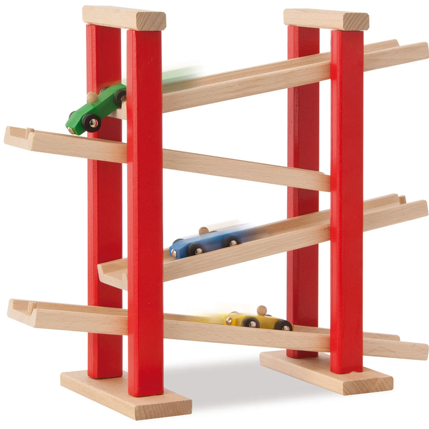 Laat je auto’s zo snel mogelijk naar beneden rijden van deze houten autobaan van Eichhorn. De autobaan heeft 4 diagonale banen en bevat 3 kleine autootjes. Spelen met de Eichhorn autobaan stimuleert oog-handcoördinatie en geeft inzicht in oorzaak-gevolgrelaties.