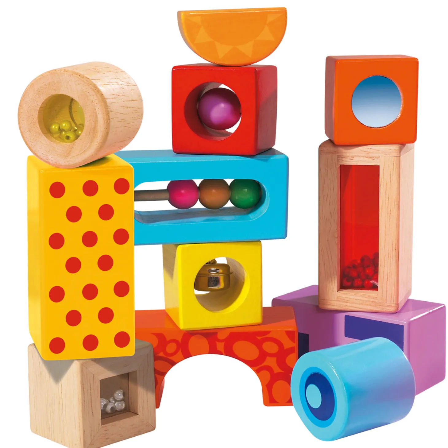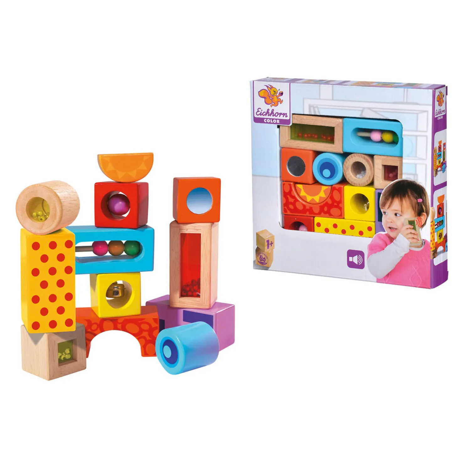 Verschillende kleuren en vormen bouwblokken met leuke geluiden, 12-delig. Van het vertrouwde en educatieve merk Eichhorn.