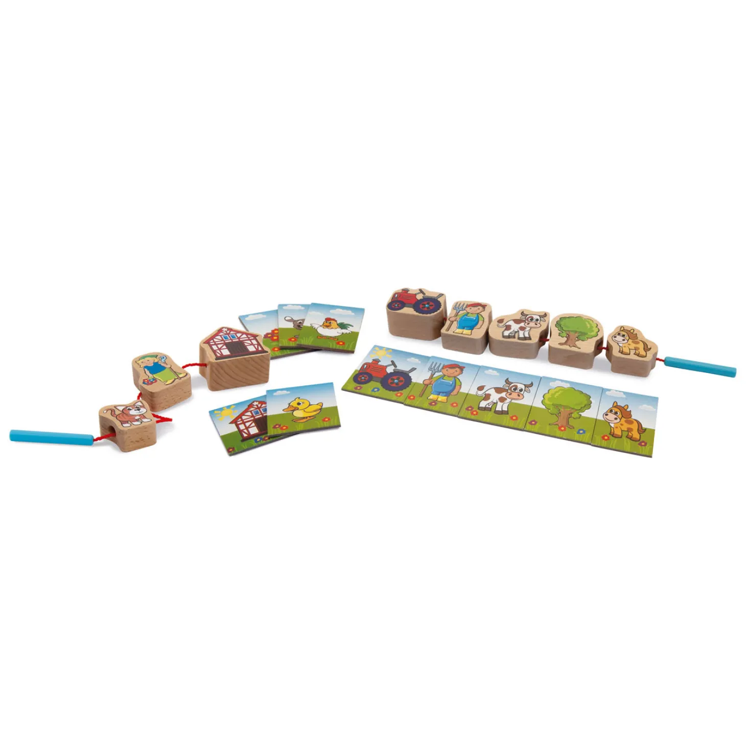 Eichhorn Houten Rijgspel, 13dlg. Leg de kaartjes op een bepaalde volgorde en rijg de blokjes in de juiste volgorde aan de veter. Geschikt voor kinderen vanaf 2 jaar oud.