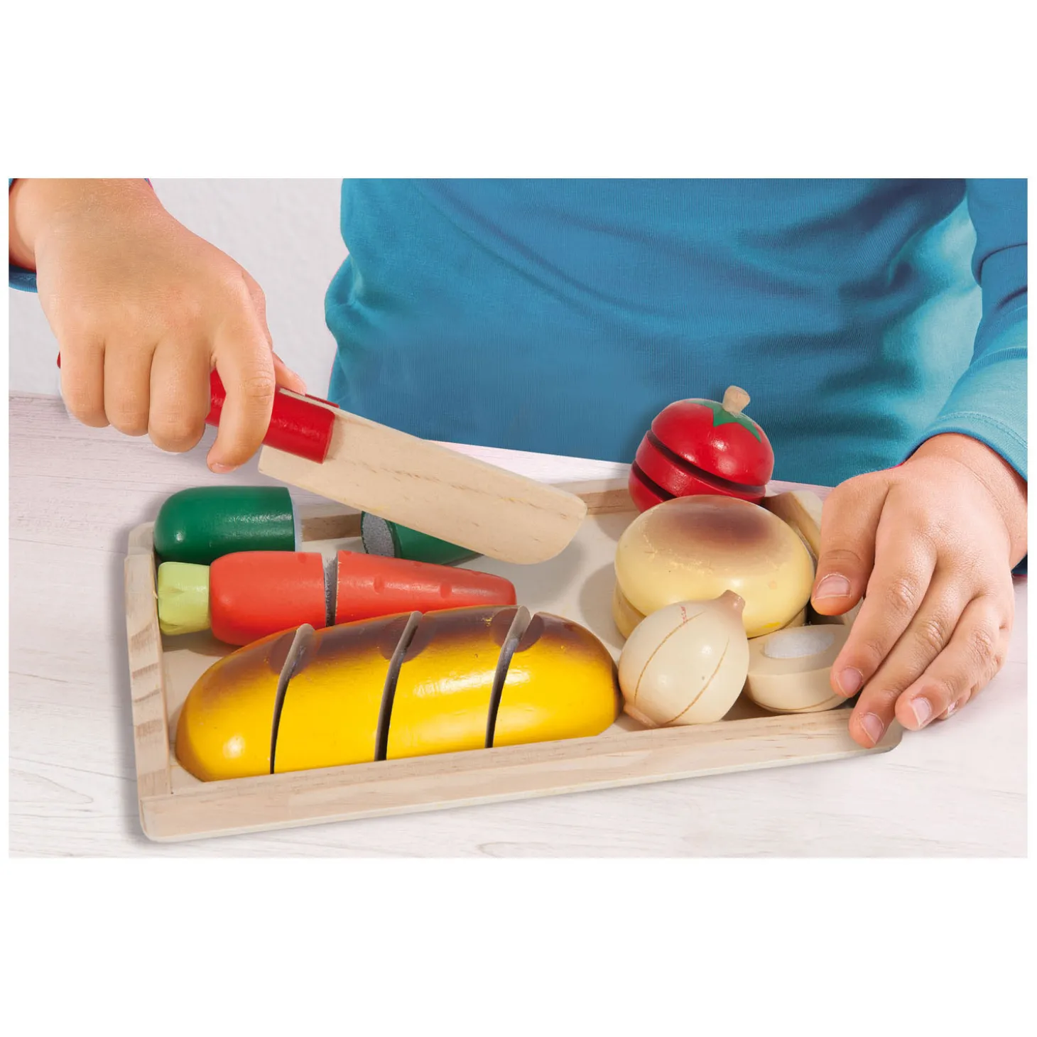 Houten snijset van Eichhorn, bestaande uit 8 delen. Snij het voedsel in stukken met het mes en plak het daarna weer aan elkaar met het klittenband. Inhoud: dienblad, “mes”, tomaat, broodje, ui, komkommer, wortel en stokbrood. Alles gemaakt van hout.Geschikt voor kinderen vanaf 2 jaar oud.
