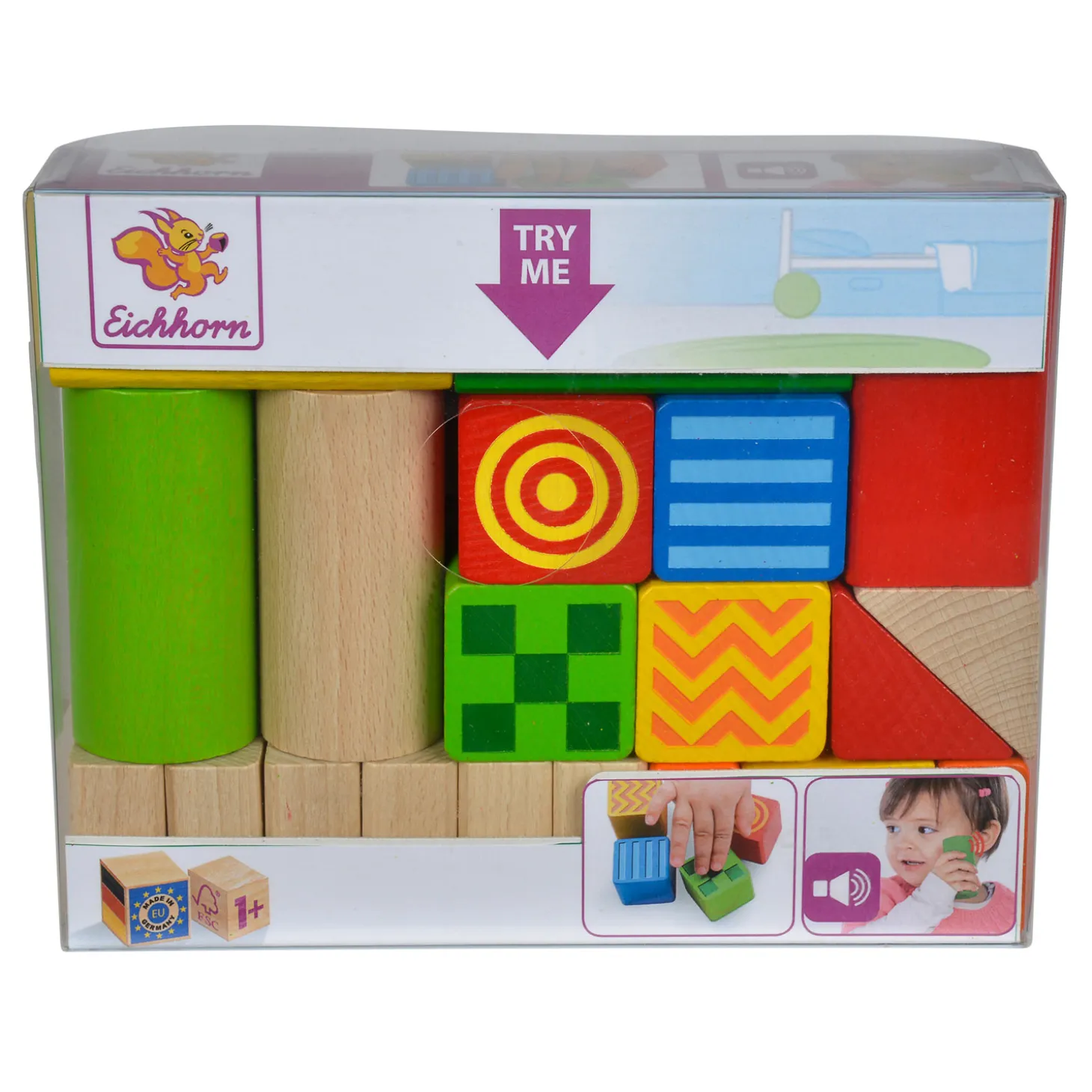 Leer vormen, kleuren en geluiden herkennen met deze Eichhorn voel en klank bouwblokken. Stapel de 20 verschillende gekleurde vormen op elkaar en hoor hoe elk blokje een ander geluid ter gehore brengt. Wat een vrolijke bouwwerken! Spelen met de voel en klank bouwblokken stimuleert de ontwikkeling van het gehoor, herkenning van vormen en de fijne motoriek.
