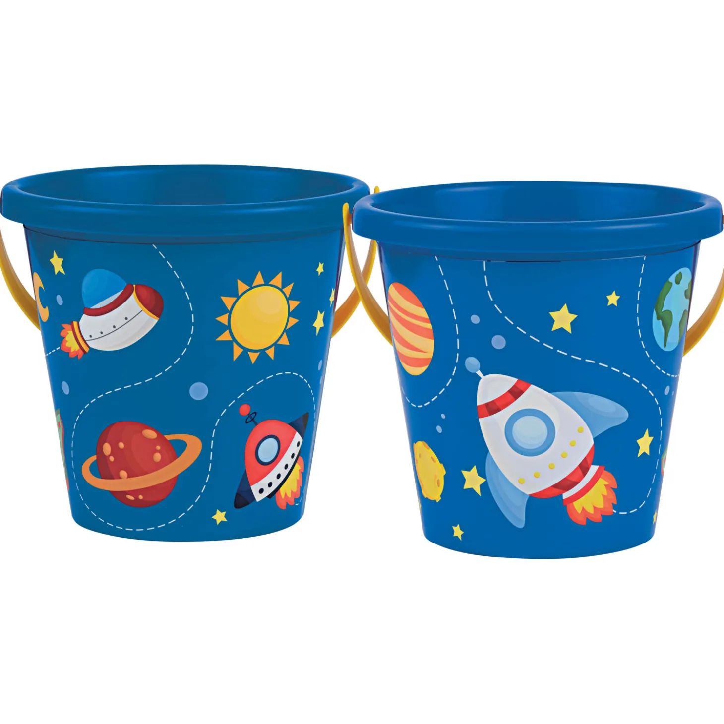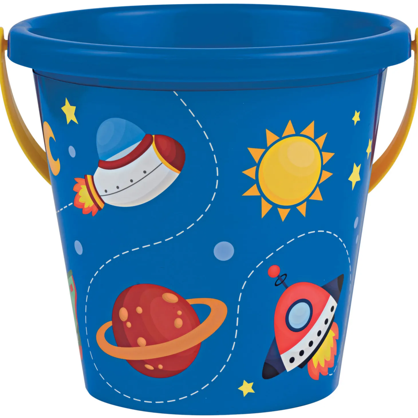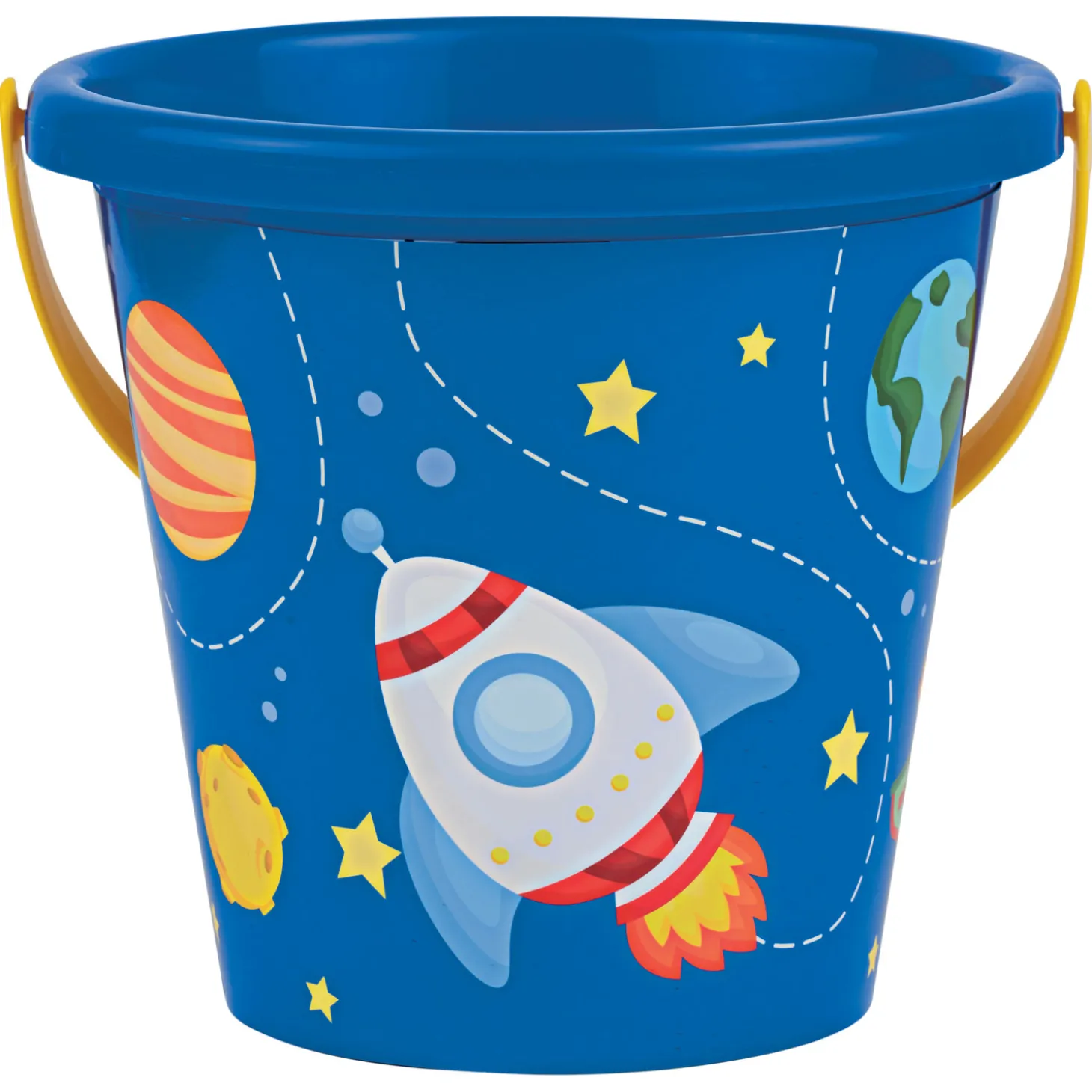 Blauwe emmer van kunststof met kleurrijk ruimtepatroon. De emmer heeft een diameter van 17 centimeter. Geschikt vanaf 12 maanden oud.
