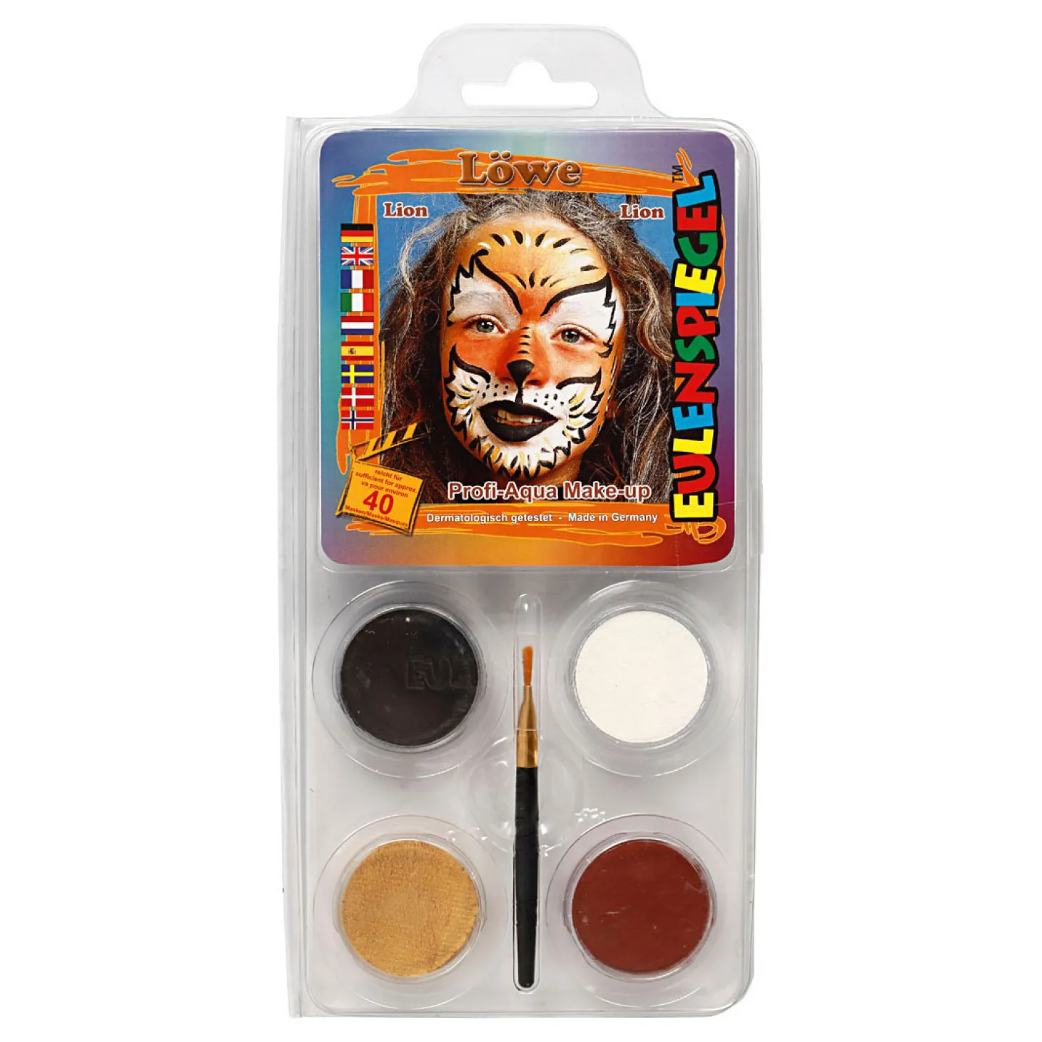 Starterset met schmink op waterbasis van Eulenspiegel voor circa 40 gezichten. Kleuren kunnen worden gemengd. Aanbrengen met een penseel of een spons. Afwassen met water en zeep.Inhoud: 4 kleuren van elk 3,5 ml, 1 penseel en uitleg