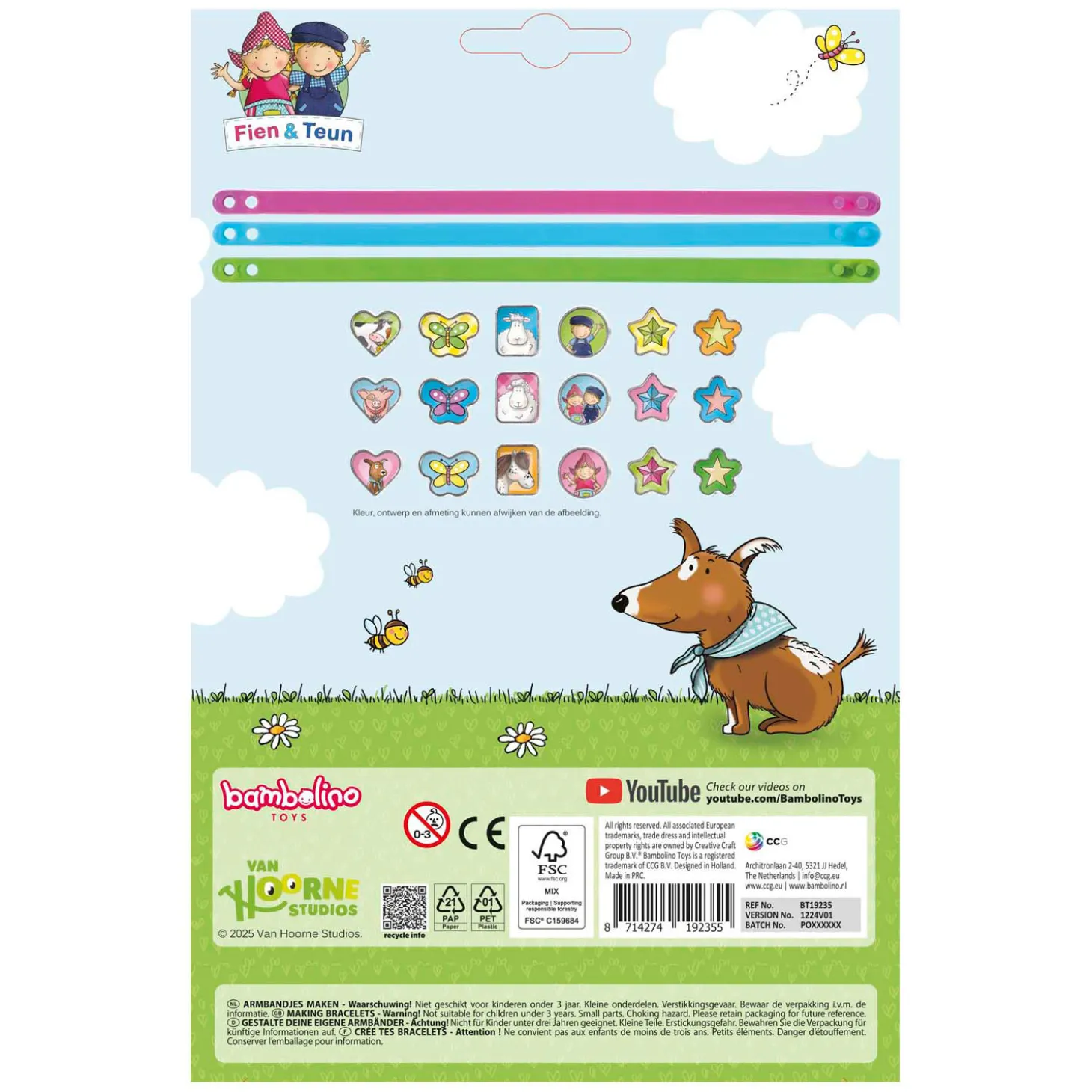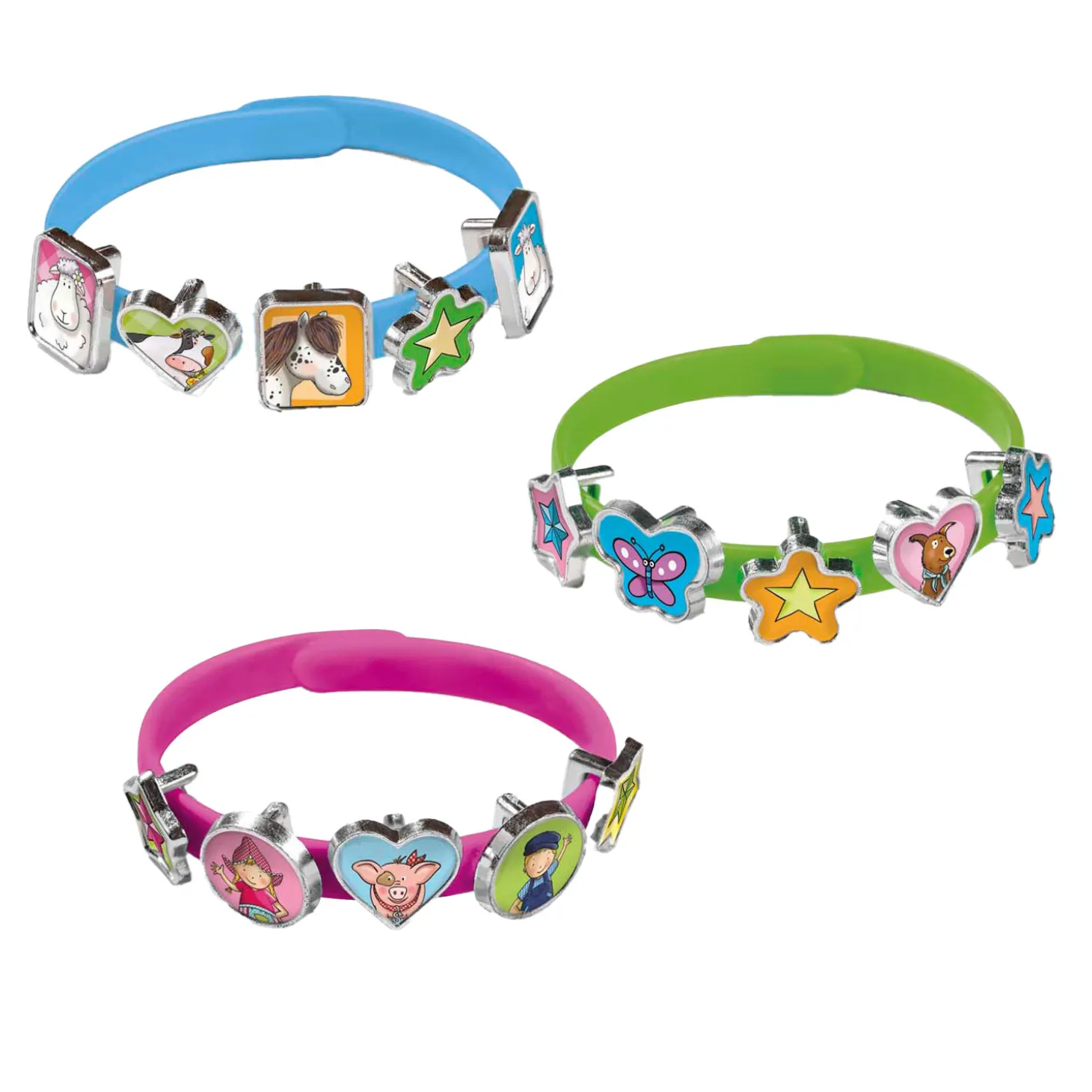 Geschikt voor kinderen vanaf 3 jaar. De set bevat 3 armbandjes en 18 bedels.
