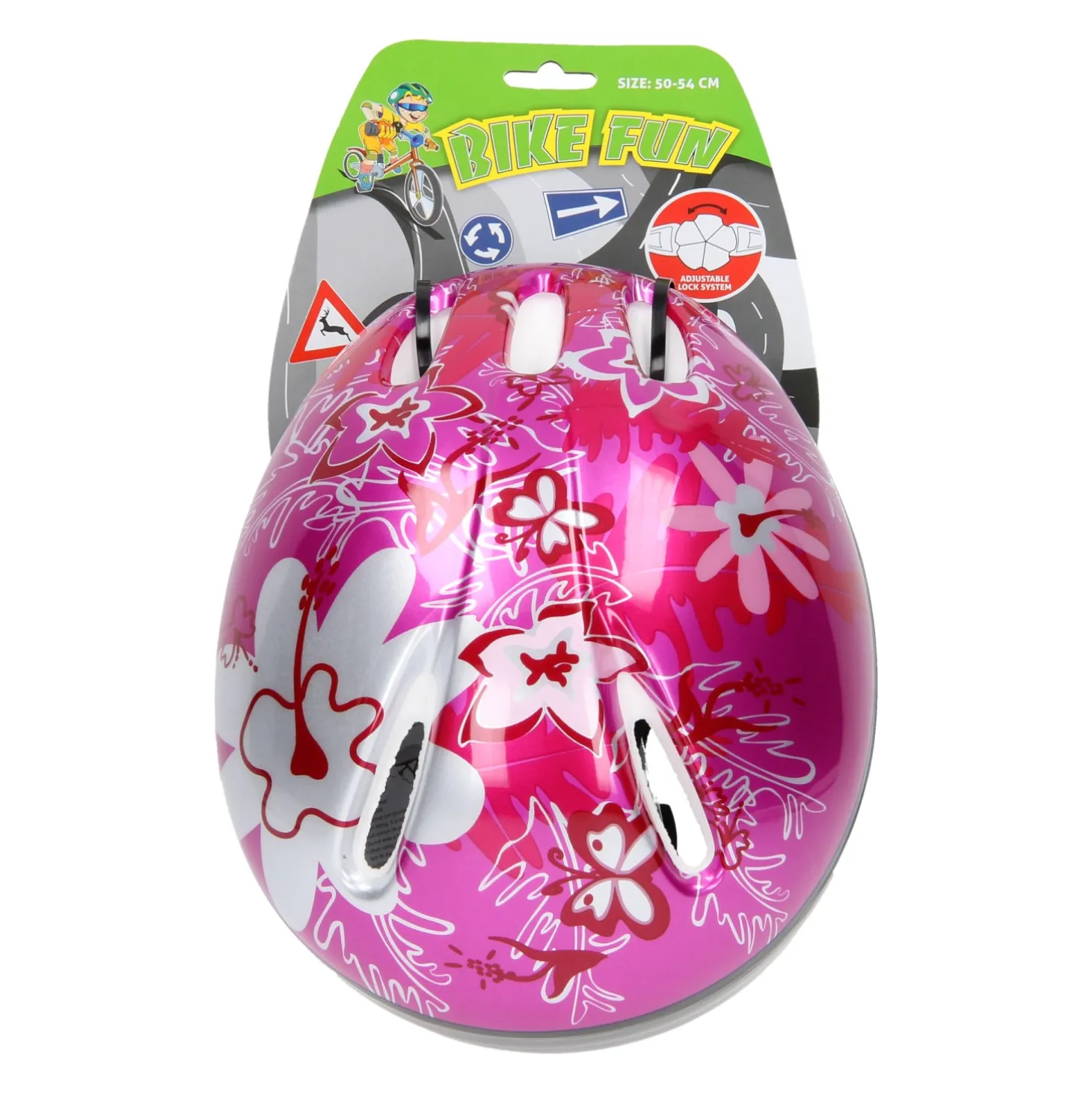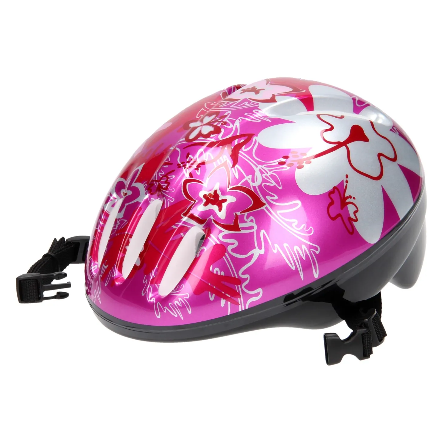 De kinderhelm is voorzien van een roze en zilveren bloemenprint.