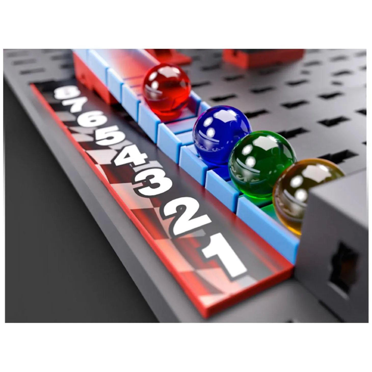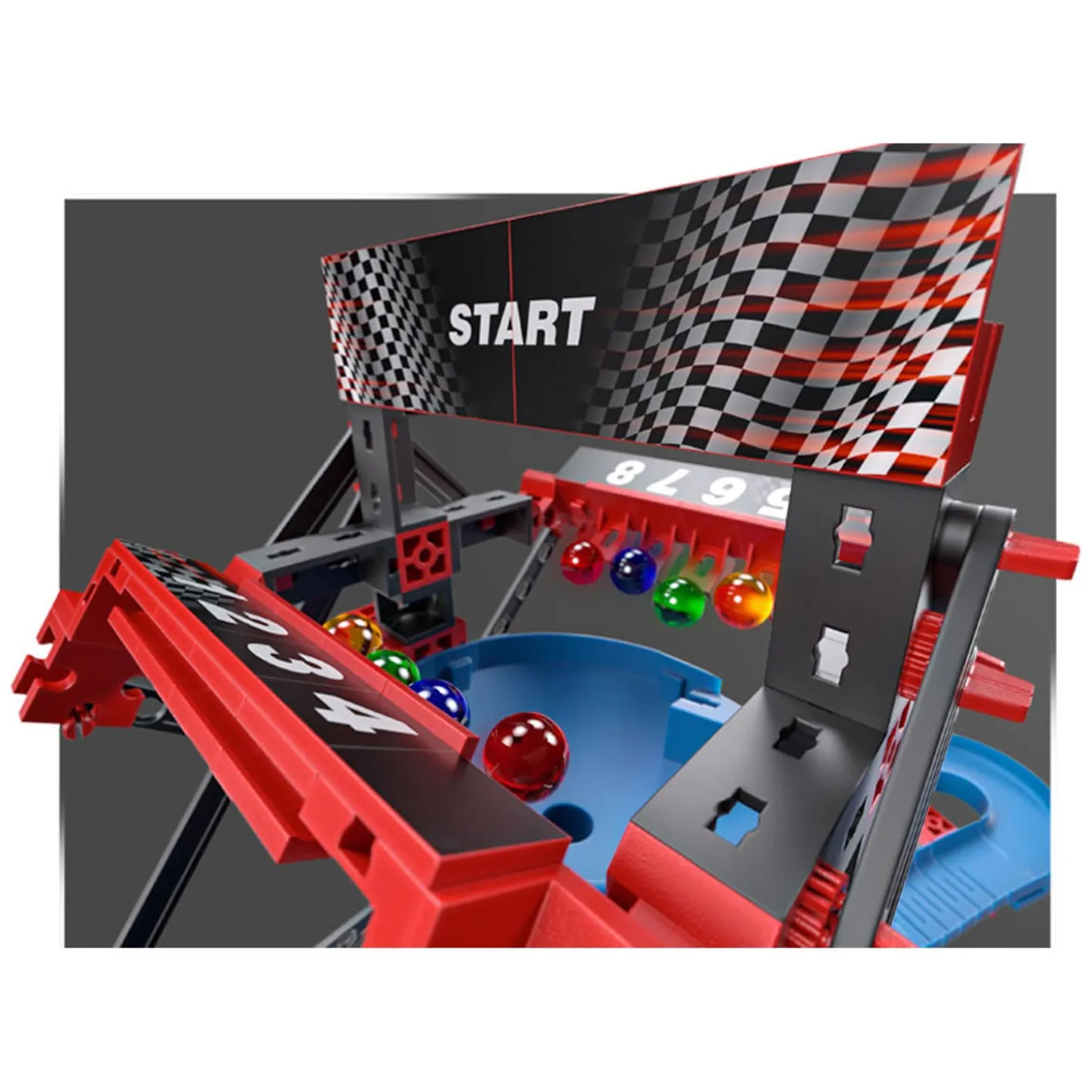 Inhoud: Flexprofiel Highspeed 180×30, 180 graden bocht, 30 verstelbare obstakels, verschillende startapparaten en kleurrijke knikkers.