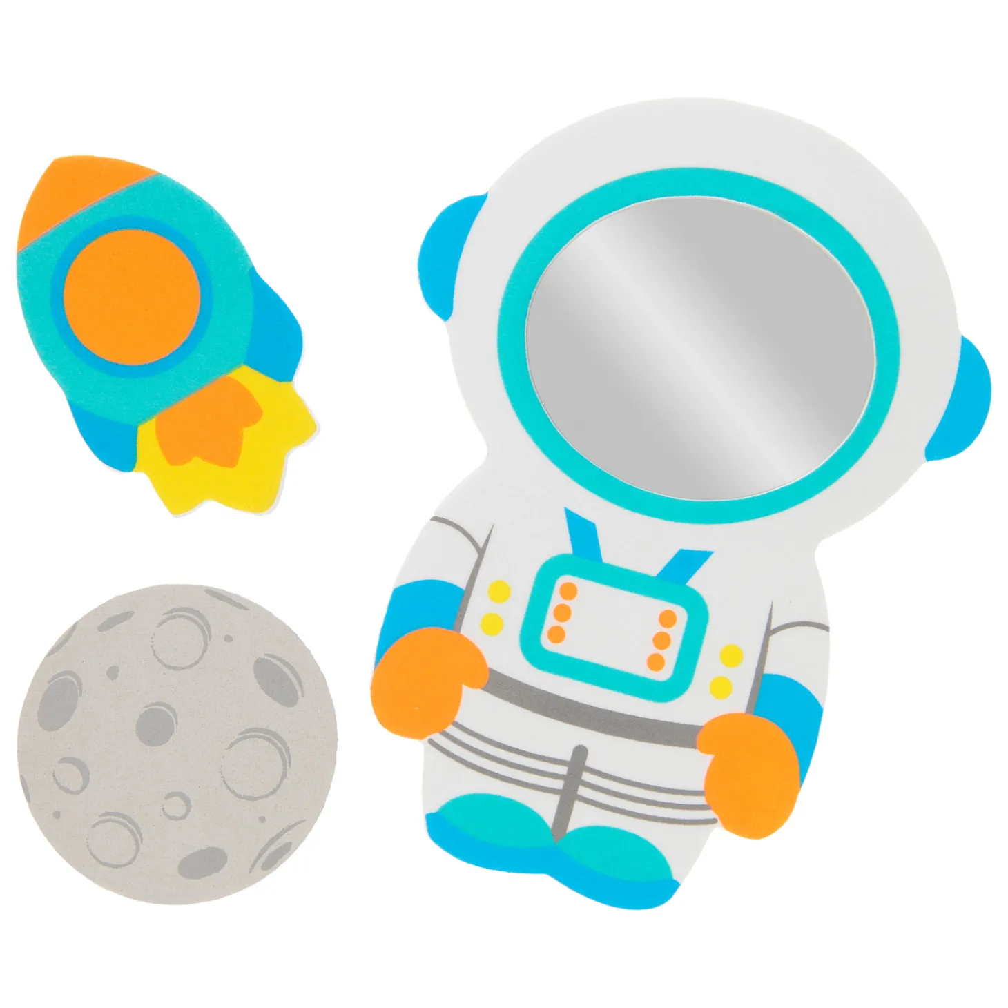 Hang dit kleurrijke ruimtevaarder spiegeltje van foam op aan de badkamertegels samen met de raket en de maan. Je kunt ze ook laten dobberen in bad. Bekijk jezelf in de spiegel of bedenk een avontuur voor deze stoere ruimtevaarder. De set bestaat uit 3 foam figuren.