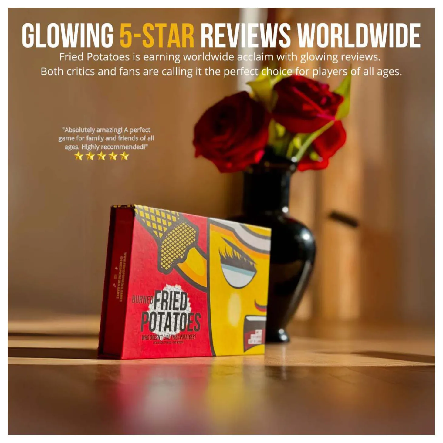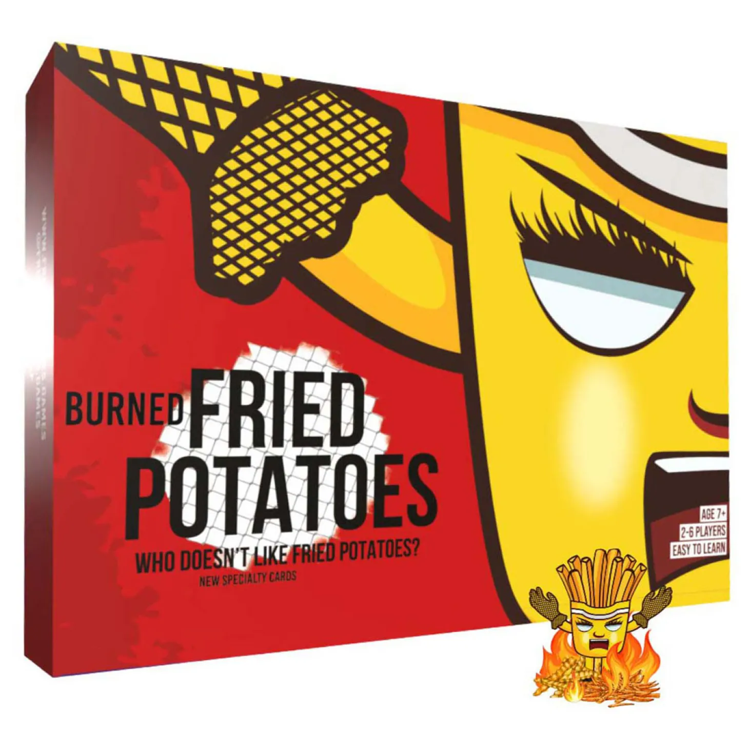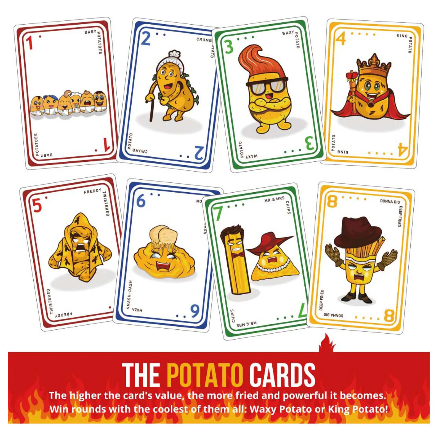 Het doel van Fried Potatoes is om je tegenstanders te frituren en het langste op het bord te overleven. Fried Potatoes is een grappig, snel slagen- kaartspel voor 2-6 spelers waar je net zo verslaafd aan zult raken als aan … Fried Potatoes! Elke ronde worden er strafpunten gegeven, en met elk stukje strafpunt kom je dichter bij de laatste ‘Fried’ tegel. Met elke gewonnen ronde kom je dichter bij de ultieme overwinning, maar pas op! De specialiteitskaarten kunnen de situatie in een oogwenk omgooien, waardoor het spel een onvoorspelbare wending neemt die je op het puntje van je stoel houdt. Wil je winnen, gebruik dan je beste strategie, zet je pokerface op en ben iedereen te slim af.