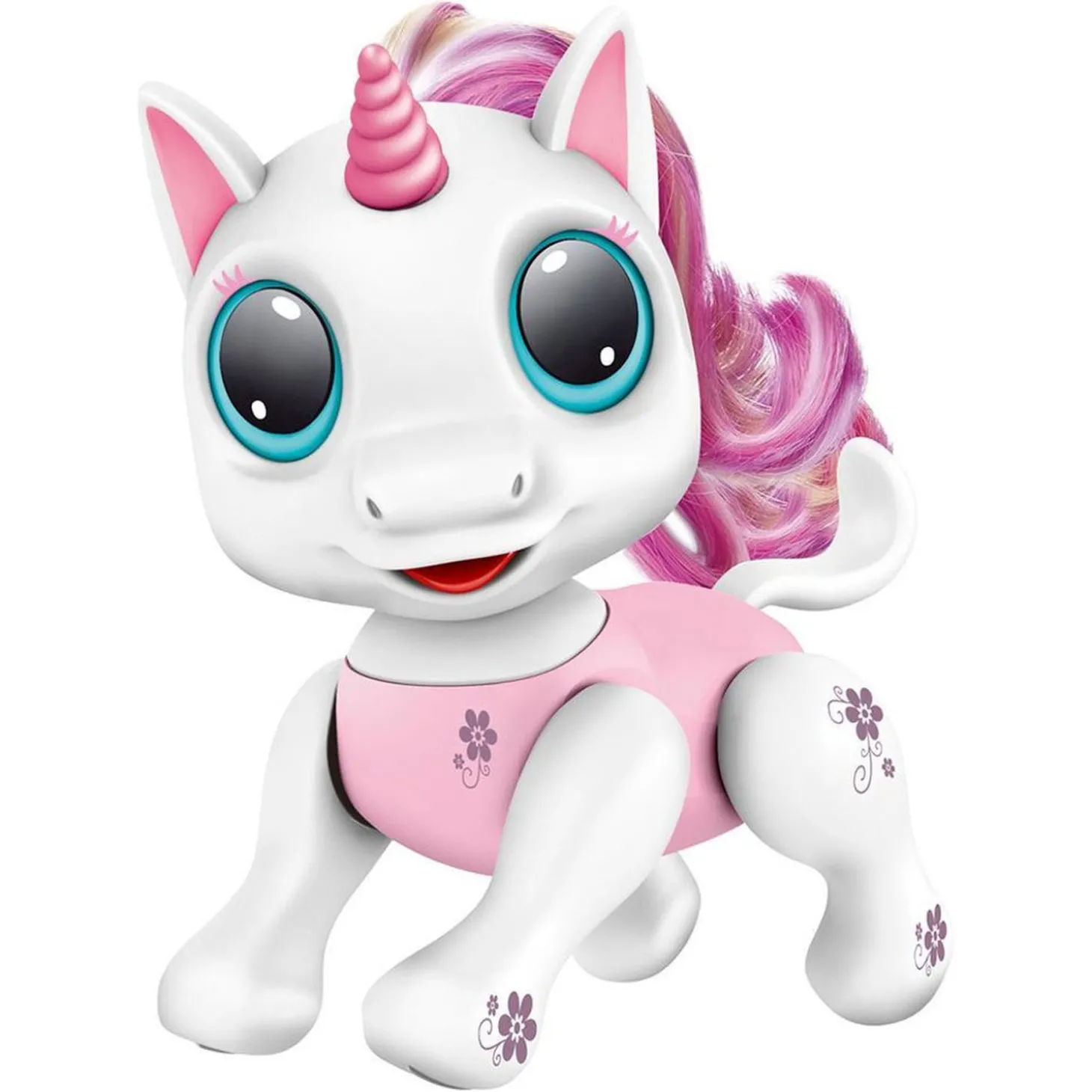 Maak kennis met de Gear2Play Little Unicorn robot! Deze schattige, interactieve eenhoornrobot is voorzien van verschillende sensoren waardoor ze reageert op aanraking. Druk op de eenhoorn, spreek je eigen teksten in en hoor hoe Little Unicorn de teksten herhaalt. Ook maakt ze hinnik- en galopgeluiden, net als een echte eenhoorn! Haar sprankelende eenhoorn licht blauw op als je erop drukt en ze maakt ook een schattig sprankelgeluid. De vrolijke Little Unicorn robot wil altijd met je spelen.