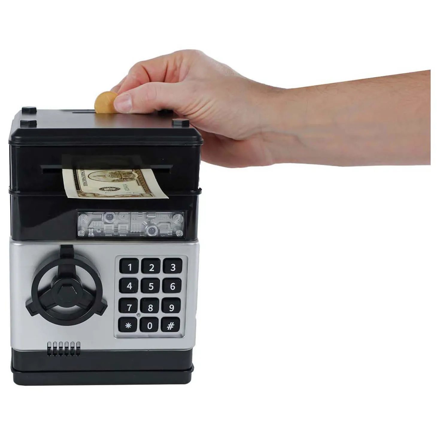 De kluis heeft licht en geluid, en is 19,5 cm groot.