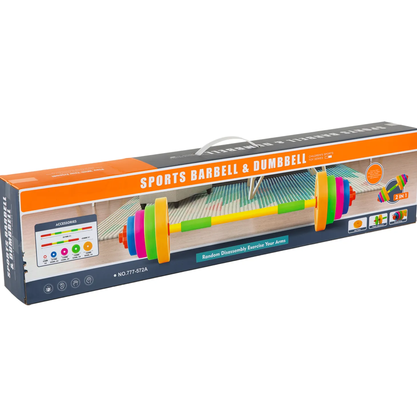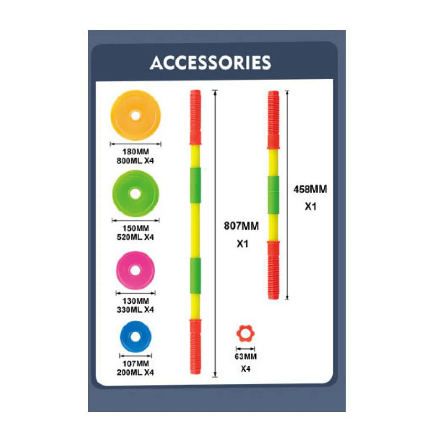 De set bestaat uit 2 verschillende stangen (80 en 46 centimeter lang), 4 klemmen, 16 schijven (4x 800 ml, 4x 520 ml, 4x 330 ml en 4x 200 ml). Geschikt voor kinderen vanaf 3 jaar.