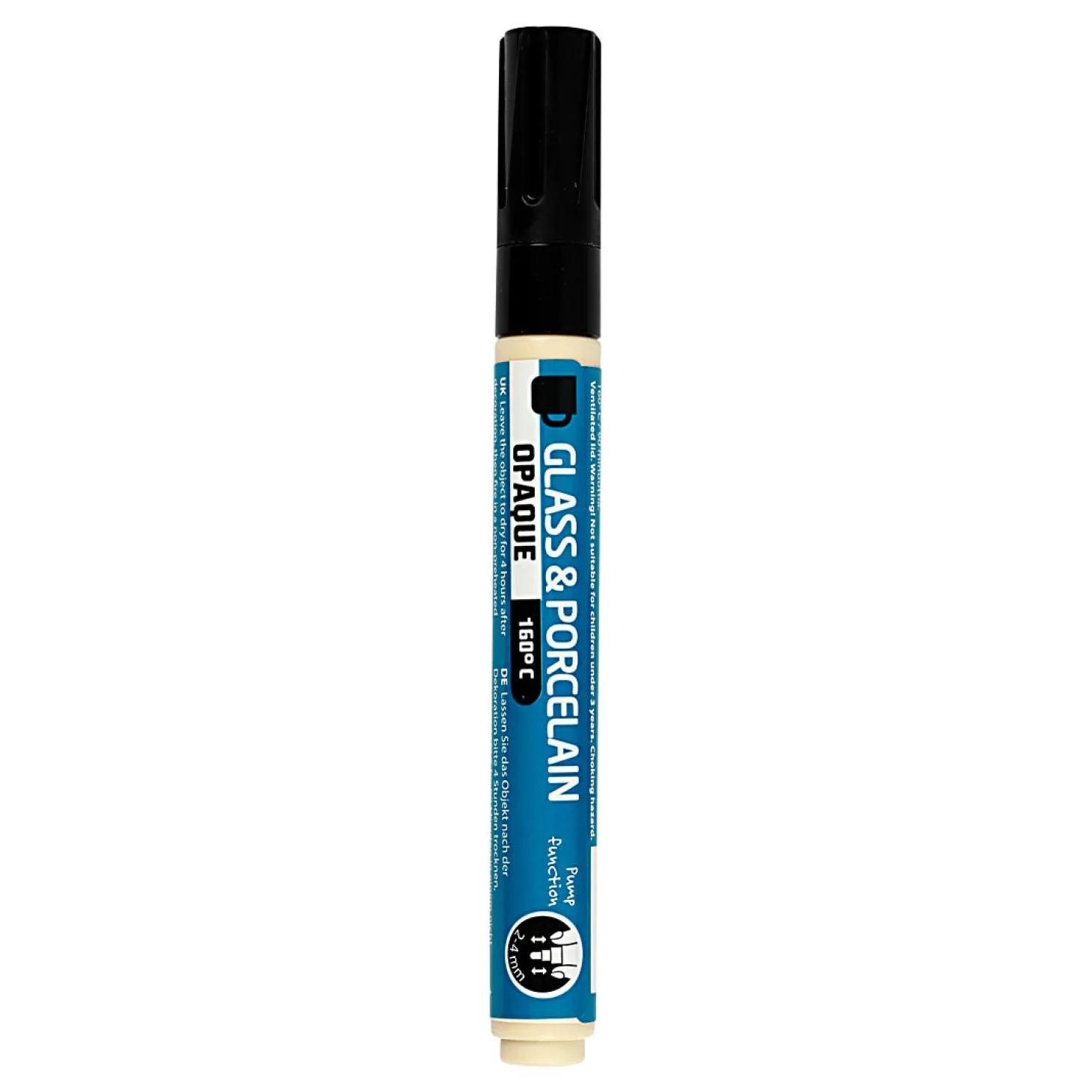 Dekkende glas- en porseleinstift op waterbasis geschikt voor zowel glas, porselein, metaal als donker keramiek.Na 4 uur drogen af te bakken in een oven gedurende 90 min op 160C – na afbakken vaatwasmachine bestendig.