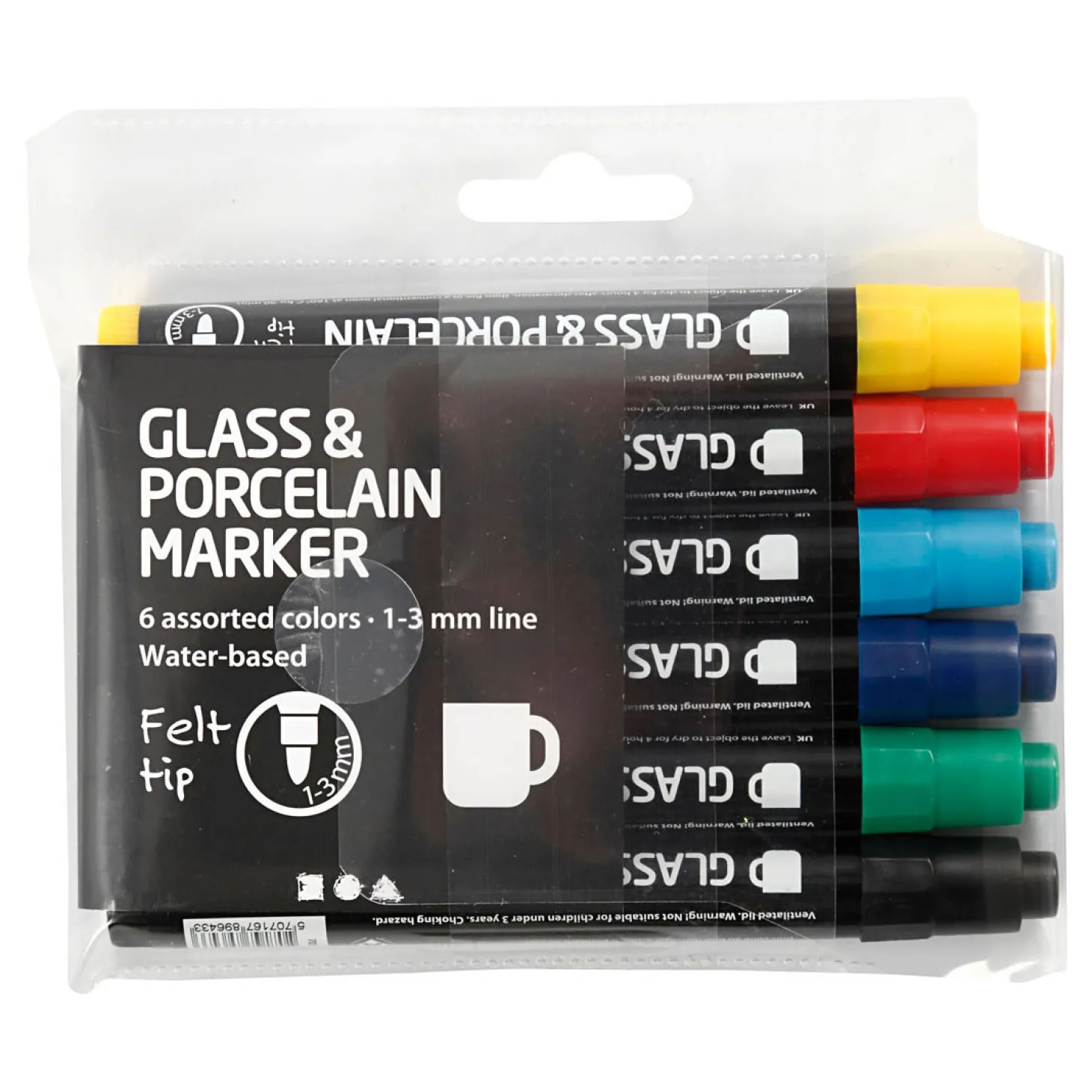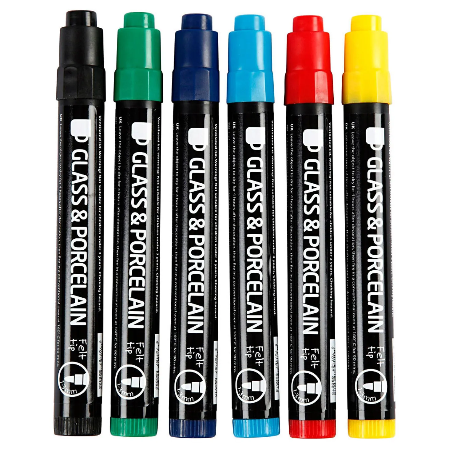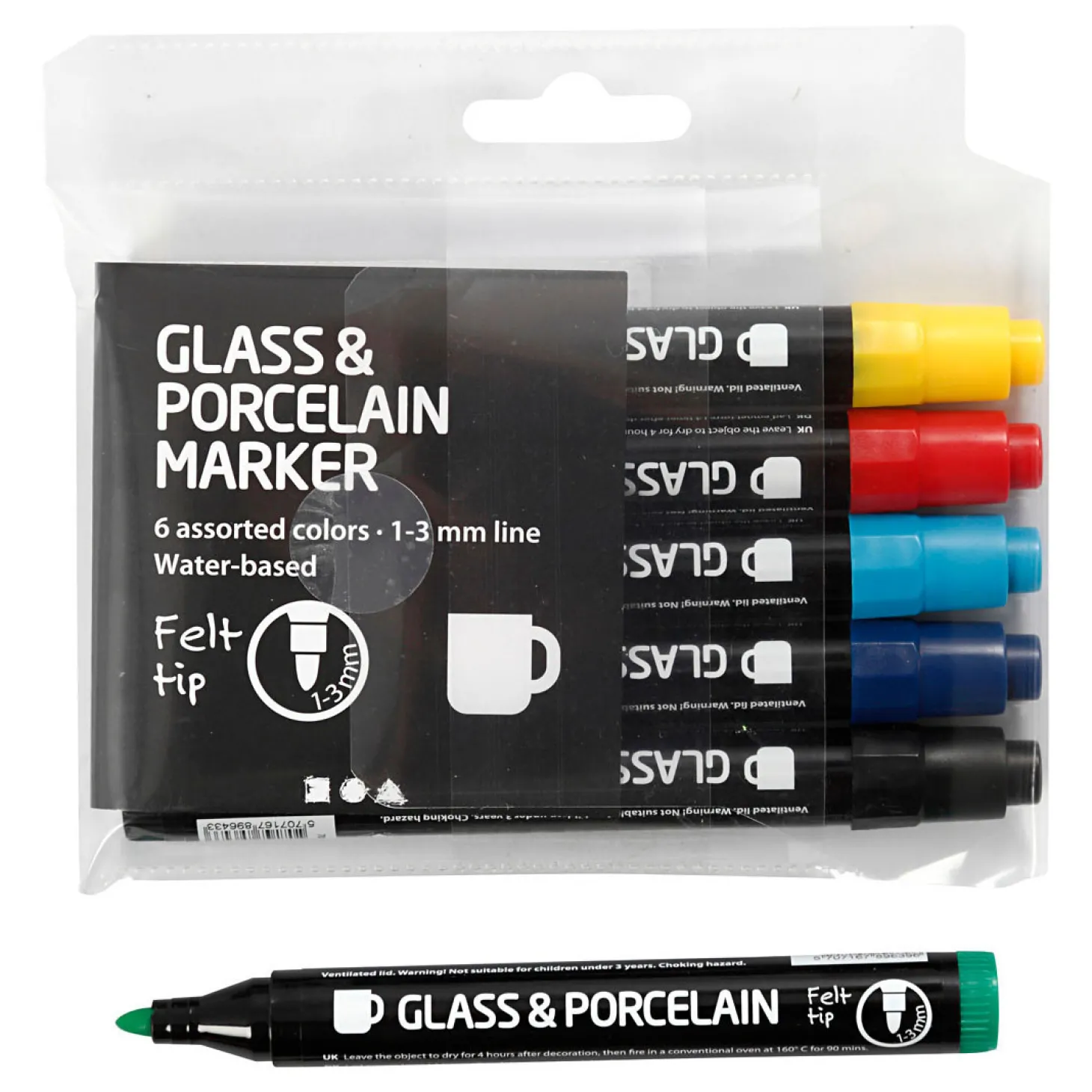 Semi-ondoorzichtige stift op waterbasis met vaste viltpunt voor glas en porselein. Na het uitharden in de oven is het product vaatwasserbestendig in milde cycli.Als u glas- en porseleinstiften nodig hebt, kunnen we deze beslist aanbevelen ze zijn goed voor veel verschillende creatieve projecten en kunnen gemakkelijk door kinderen worden gebruikt. Als u uw eigen stuk glas of porselein wilt versieren, moet het oppervlak schoon en vetvrij zijn en het afgewerkte stuk moet vier uur drogen. Zet het daarna in een koude oven, stel de temperatuur in op 160 graden en laat het 90 minuten uitharden.