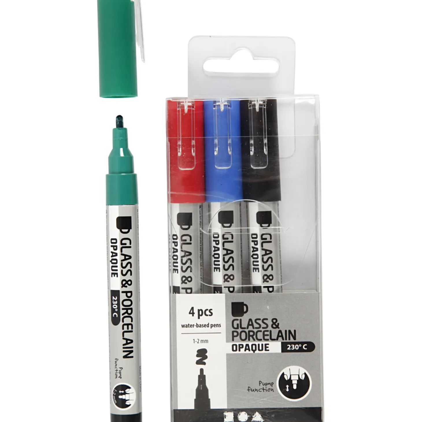 Versier ieder glas- en porseleinwerk met deze vier porseleinstiften. Ga je een koffiemok versieren? Zorg dat de mok schoon en vetvrij is en plaats er een originele tekening op. Laat de tekening vervolgens 8 uur drogen om het daarna 40 minuten in de oven af te bakken op 230 °C (geen hetelucht- of stoomoven). Laat de mok na afloop even afkoelen. Na deze handelingen is je mok klaar voor gebruik! De tekening is zelfs vaatwasserbestendig. Bij deze stiftenset ontvang je de kleuren zwart, blauw, groen en rood.