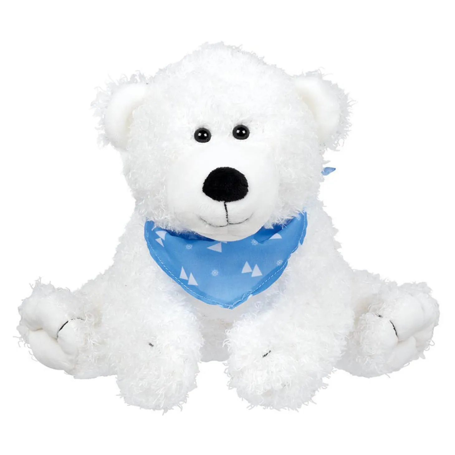 Dit is ijsbeer Tom! Hij is wit, zacht en houdt van knuffelen. Hij heeft een blauw sjaaltje om.