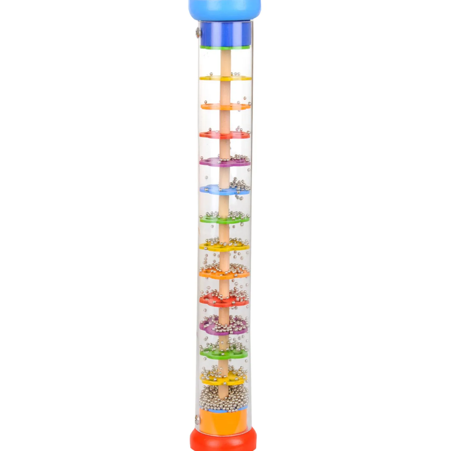 Boots het geluid van regen na met de regenbuis. De metalen balletjes vallen naar beneden als je de buis omkeert.