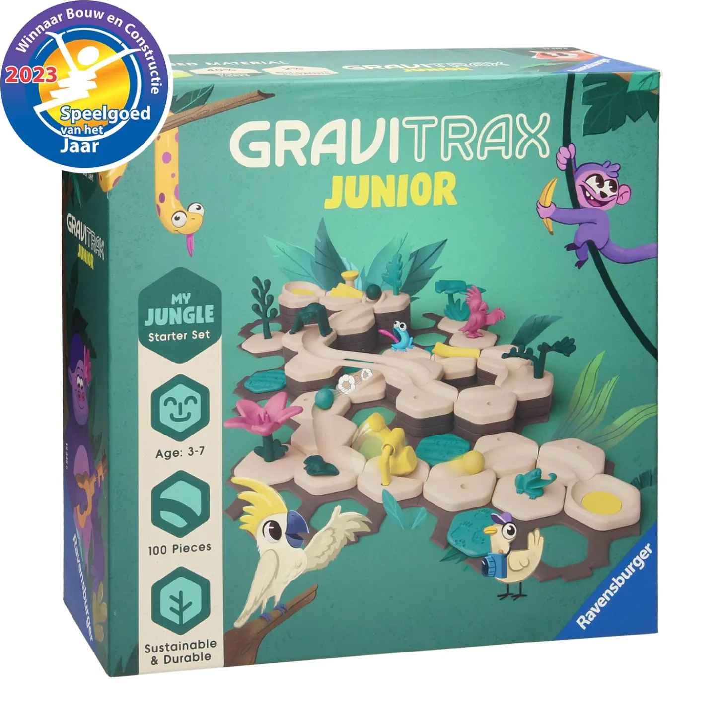 Deze GraviTrax Junior starterset My Jungle neemt kinderen mee naar de wereld van de jungle. De set bevat alles om direct te beginnen met bouwen aan jouw unieke knikkerbaan. Met een grote hoeveelheid elementen en dierfiguren van hout-biokunststof beleven kinderen de themawereld van de jungle van dichtbij terwijl ze decoreren en spelen. Bouw- en speelplezier worden op een unieke manier gecombineerd! GraviTrax Junior is een interactief kogelbaansysteem. Kinderen bouwen naar hartenlust hun eigen kogelbaanwereld en kunnen deze decoreren met allerlei verschillende themasets.