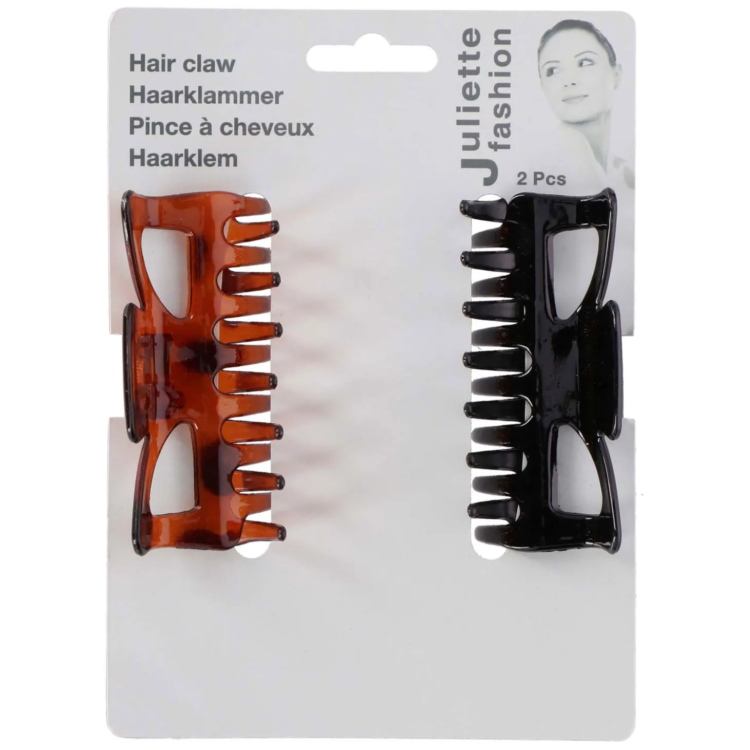 Set van 2 kunststof haarklemmen: een zwarte en een bruin gevlamde. De haarklemmen zijn ca. 9 centimeter groot.