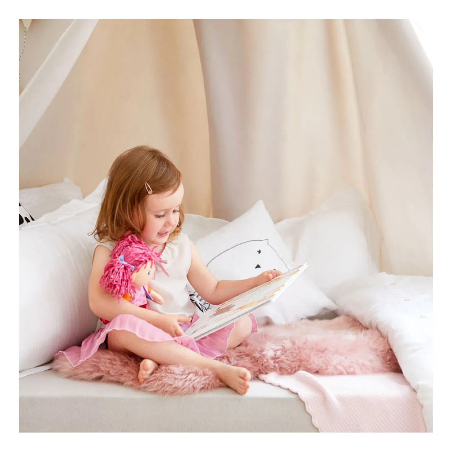 ‘Hallo, ik ben Haba Pop Lilly-Lou. Waar ik ben, is er altijd iets te beleven! Ik doe immers graag gek. En leuke moppen vertellen kan ik ook!’ Deze zachte pop van polyester draagt een roze-blauw omkeerbaar hesje en een drielaagse rok (die met behulp van klittenbandsluiting aan en uit kunnen), heeft een gewatteerd lichaam met aangenaaide schoenen en roze haar van chenille met 2 haarbanden. Lengte: 30 centimeter.