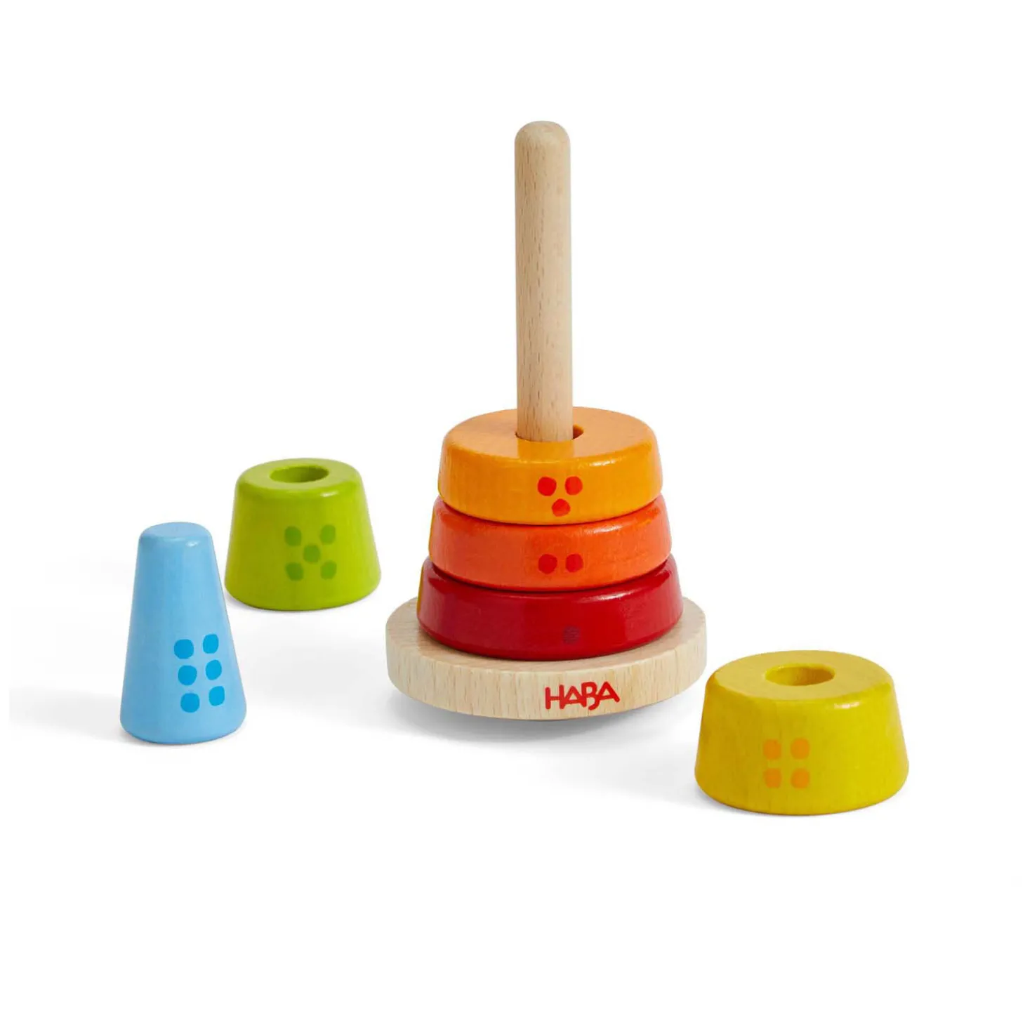 Regenboogkleurig opsteek- en speelplezier voor de allerkleinsten: als de gemakkelijk te pakken houten onderdelen in de juiste volgorde op de ronde staaf worden gestoken, ontstaat een kleurrijke wiebeltoren. Dankzij de opgedrukte stippen doen kinderen meteen hun eerste ervaringen op met tellen.traint het herkennen en benoemen van kleuren