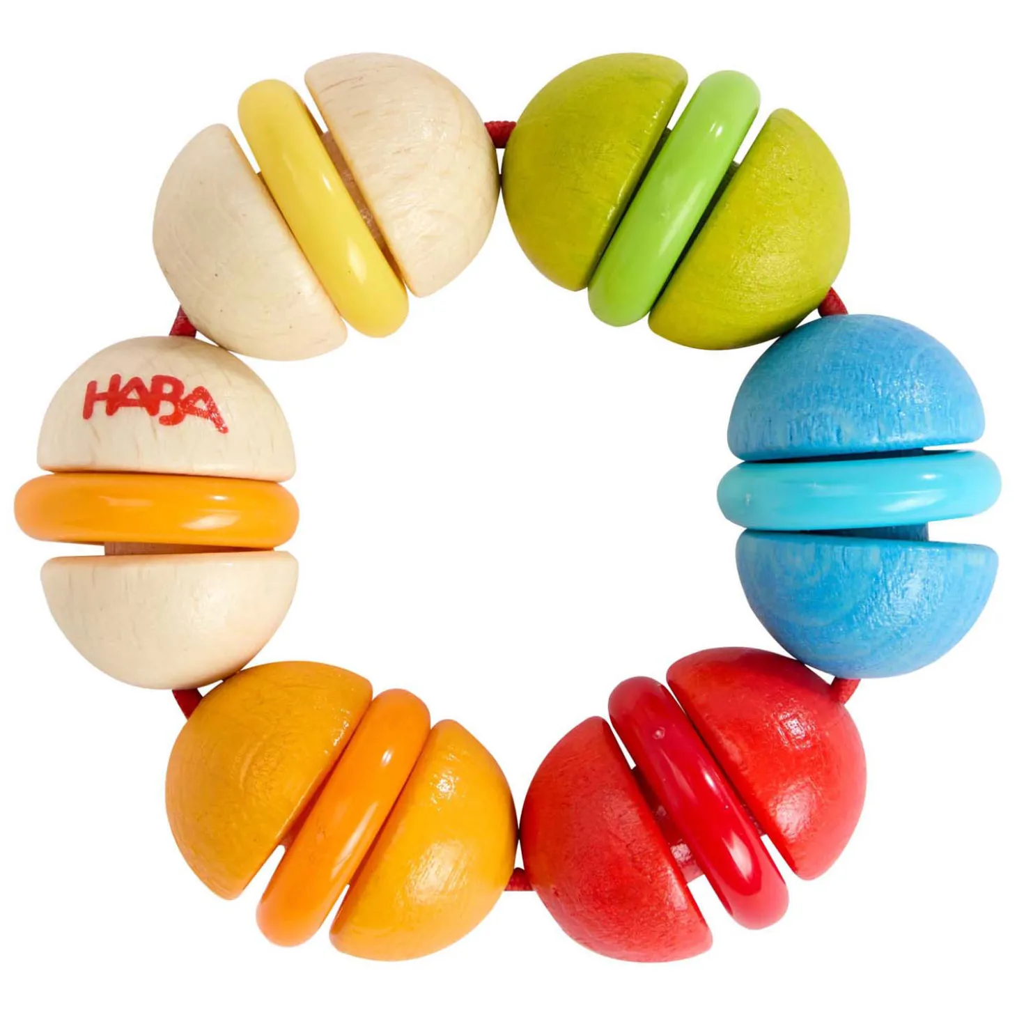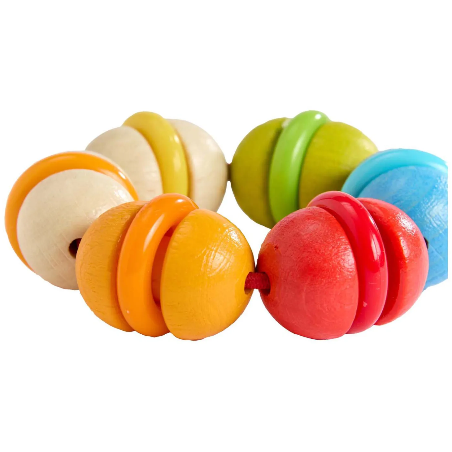 Deze rammelaar heeft al op de allerkleinsten een magische aantrekkingskracht, o.a. vanwege de rammelringen tussen de halve knikkers die het spelen opvrolijken met akoestische effecten. Bovendien zijn de mix van materialen en de vele kleuren onweerstaanbaar en kunnen deze uitgebreid worden verkend.