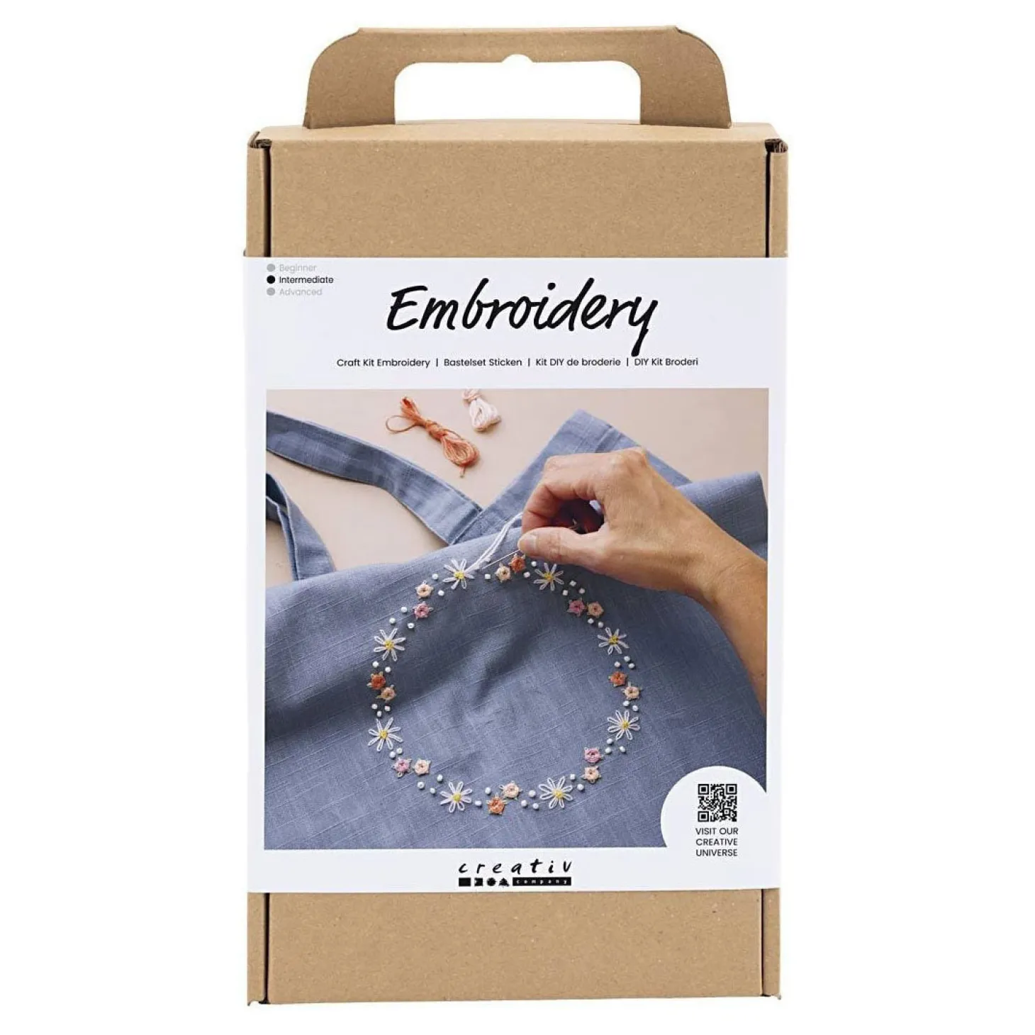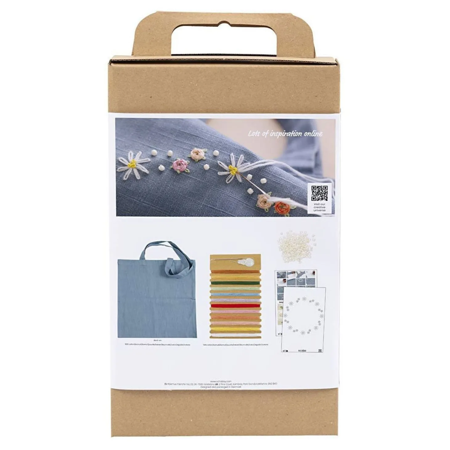 Met deze set kunt u uw textielen tas borduren. De set bevat alle materialen die u nodig hebt, inclusief alle instructies.Als u een draagtas wilt borduren, is dit de perfecte set voor u. De set bevat alles wat u nodig hebt om aan de slag te gaan. De krans is geborduurd met mille fleursteek, geweven rozen, Franse knopen en kraaltjes. Er staan instructies op de achterkant van de doos, maar u kunt ook de QR-code scannen en de online-instructies volgen.Inhoud: Draagtas, borduurgaren, kralen, naald, naalddoorsteker