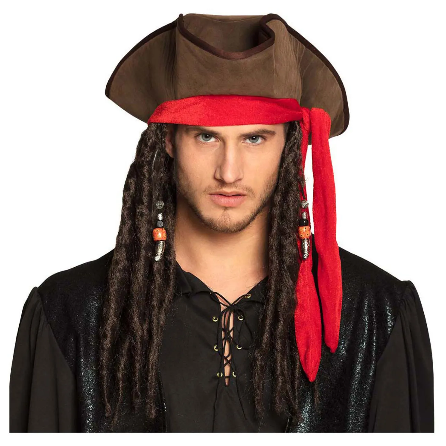 • Bruine piratenhoed met ingebouwde dreadlocks en rood hoofddoekje