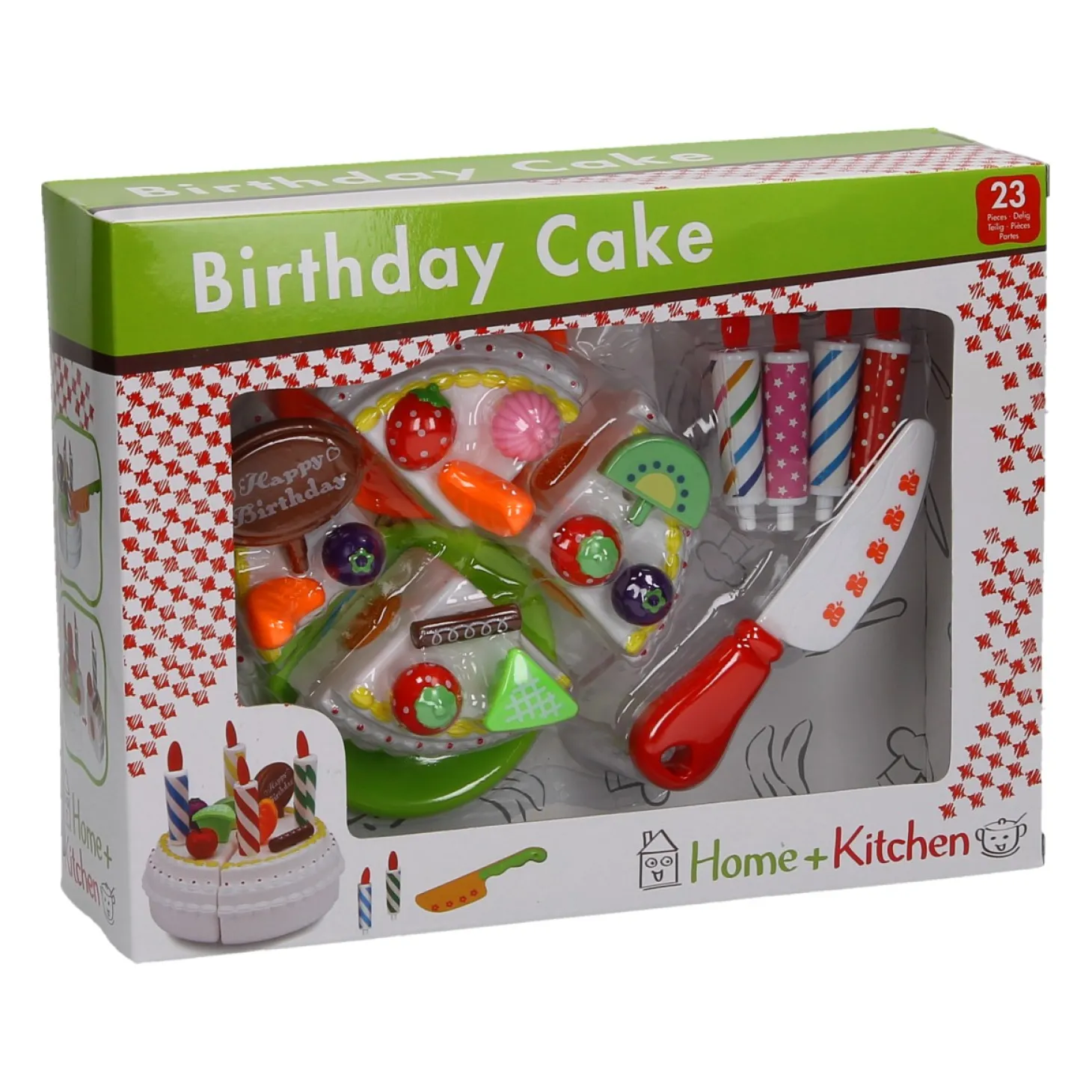 Deze 23 delige set bestaat uit verschillende toppings voor de taart, bordjes, kaarsjes, taartpunten en een mes.